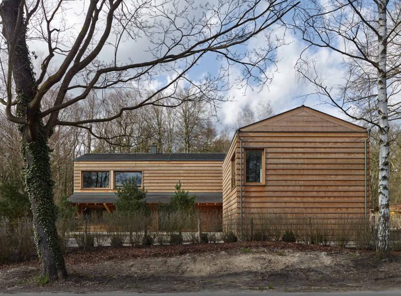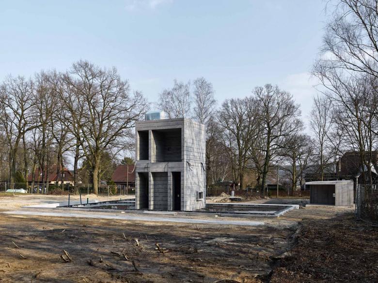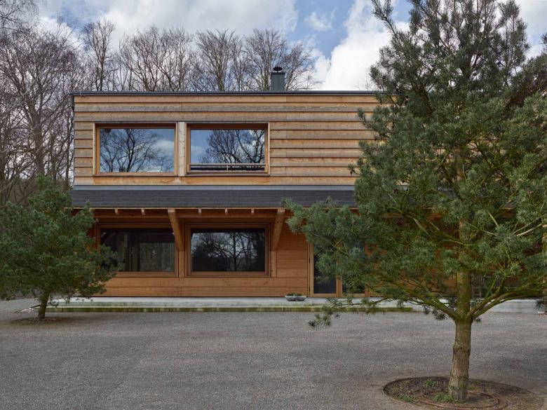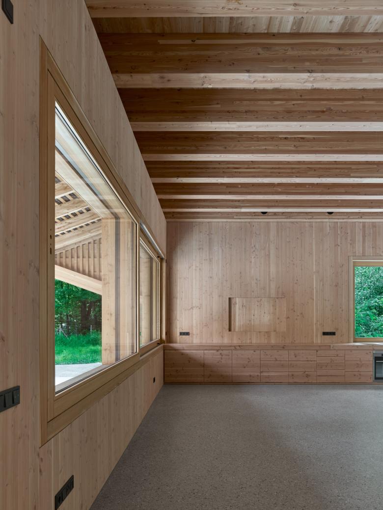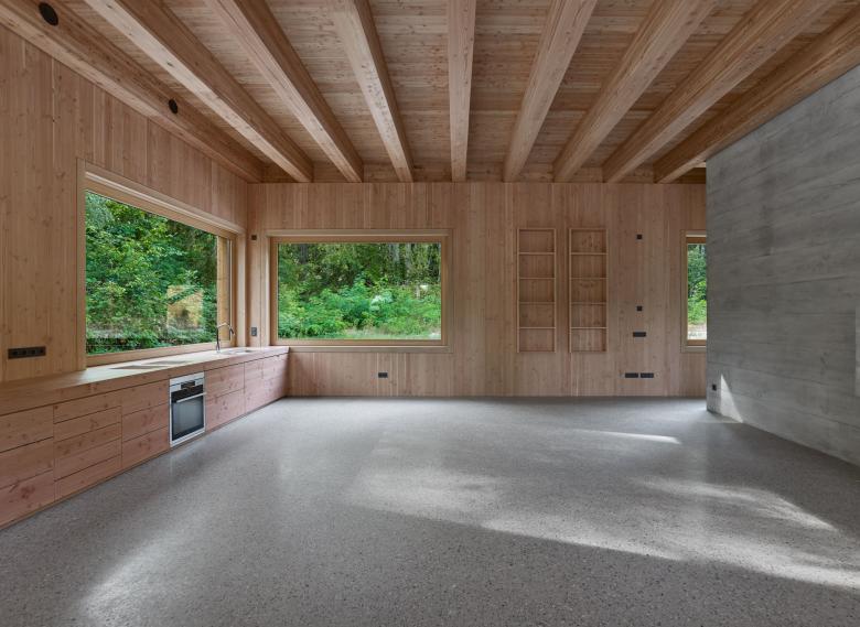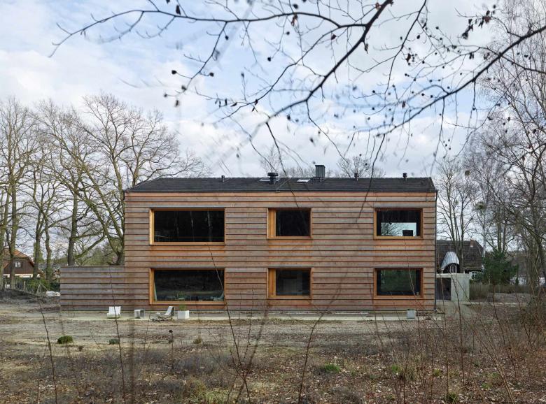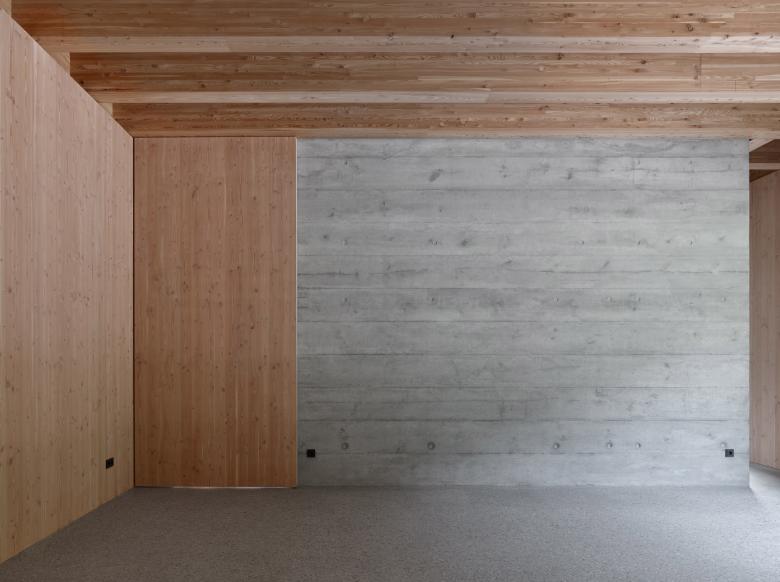 Der stereometrische Bezug der Baukörper untereinander entsteht durch präzise Setzung der Volumen um einen dreiseitig umschlossenen Innenbereich, welcher über ein Eingangsgebäude mit Garagenstellplatz erschlossen wird. Eine über die gesamte Länge des Hauptgebäudes laufende Veranda mit frei ausladendem Vordach bildet einen nach Süden gerichteten Aufenthaltsbereich und ist ein Ort der Begegnung.