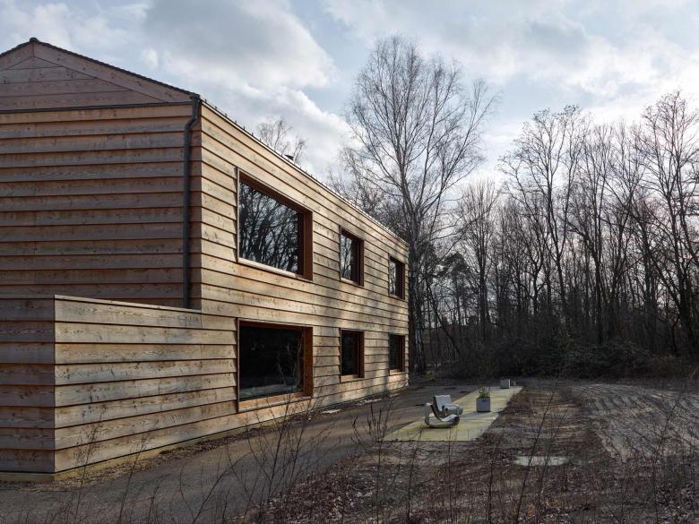 Die 2-geschossigen Ateliergebäude wurden in Holztafelbau errichtet. Das Hauptgebäude ist unterkellert. Ein Kern aus Stahlbeton beinhaltet die Nebenfunktionen und trennt die Geschossebenen mittig in je 2 Nutzbereiche.