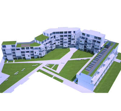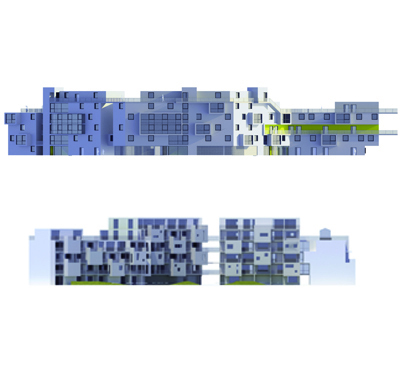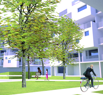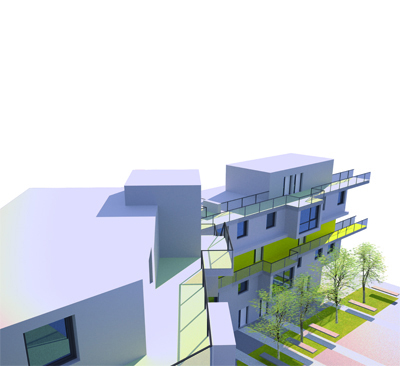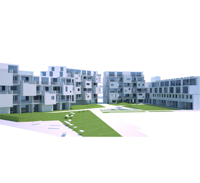Das städtebauliche Leitprojekt der geknickten, durchgehenden Bebauung wird in unterschiedlichen Höhen interpretiert. Neue NutzerInnenprofile wie Wohngemeinschaften, Wohnen und Arbeiten und Patchworkfamilien sind in offen strukturierten, flexiblen Wohnungen organisiert, die in Richtung Süden Erkerboxen als Erweiterungsräume erhalten.