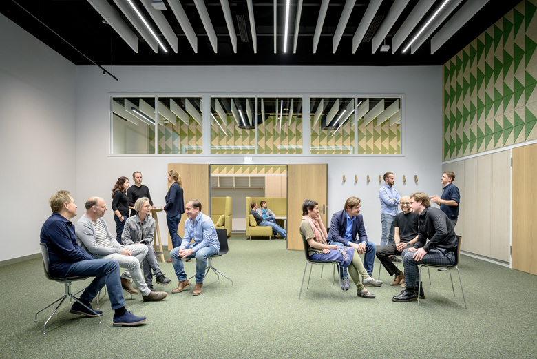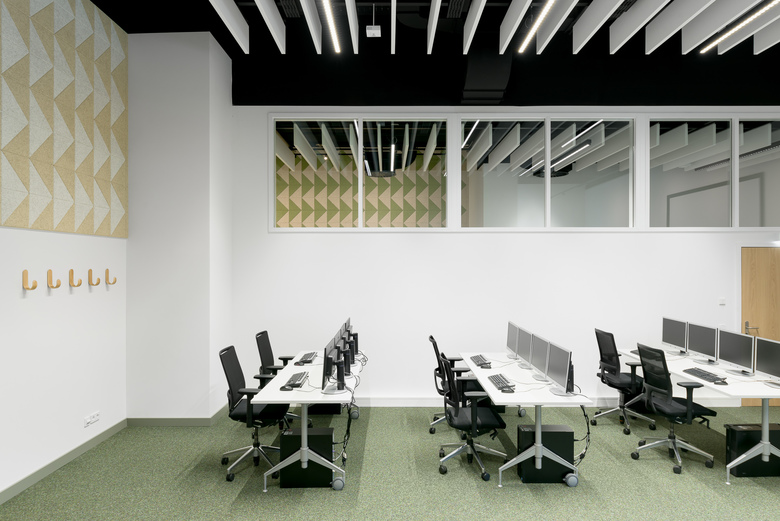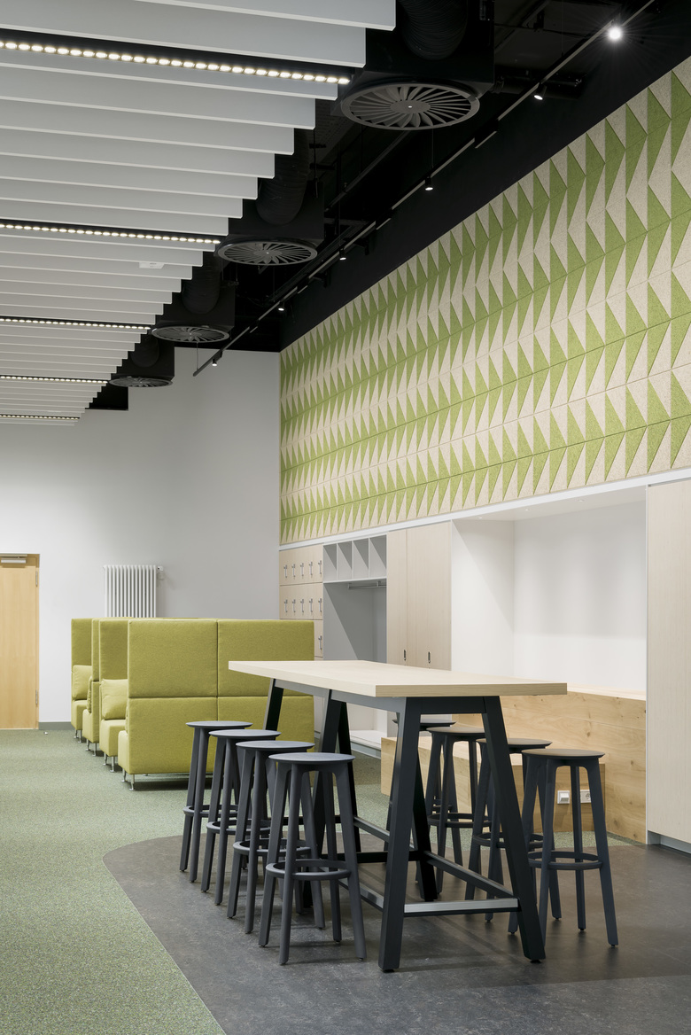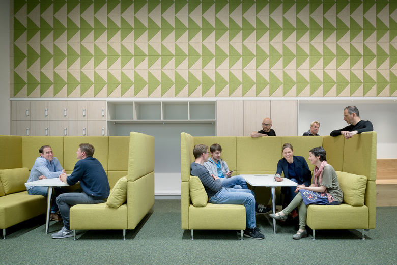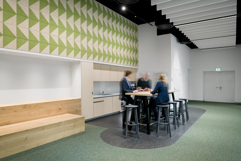 Durch hochwertige Eichen-Doppelflügeltüren hindurch bildet der grüne, farbintensive Kugelgarnboden einen Ringschluss zwischen den drei gleichgroßen Räumen. Selbige verbindende Raumwirkung haben wandgroße Grafiken aus naturbelassenen und gefärbten Holzwolle-Akustikpanelen und Deckenfelder aus weißen Akustik-Buffeln, welche die offenen, schwarzen Technikdecken horizontal begrenzen. Sie sind aus den Nachbarräumen erlebbar und erzeugen erweiternde und belebende Durchblicke.