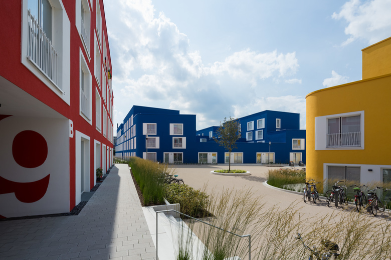 Die Wohnanlage wurde im Passivhausstandard errichtet. Sie bietet in 447 Wohneinheiten Platz für 535 Bewohner. Die Solitäre mit drei Etagen plus Staffelgeschoss haben die gleichen Wohnungstypen, differenzieren sich lediglich durch Drehen und Spiegeln der Grundrisse. Unter jedem Wohnblock befindet sich die zentrale Haustechnik im Untergeschoss. Die Bäder sind als Nasszellen konzipiert und wurden als Fertigteil komplett in den Rohbau gesetzt.