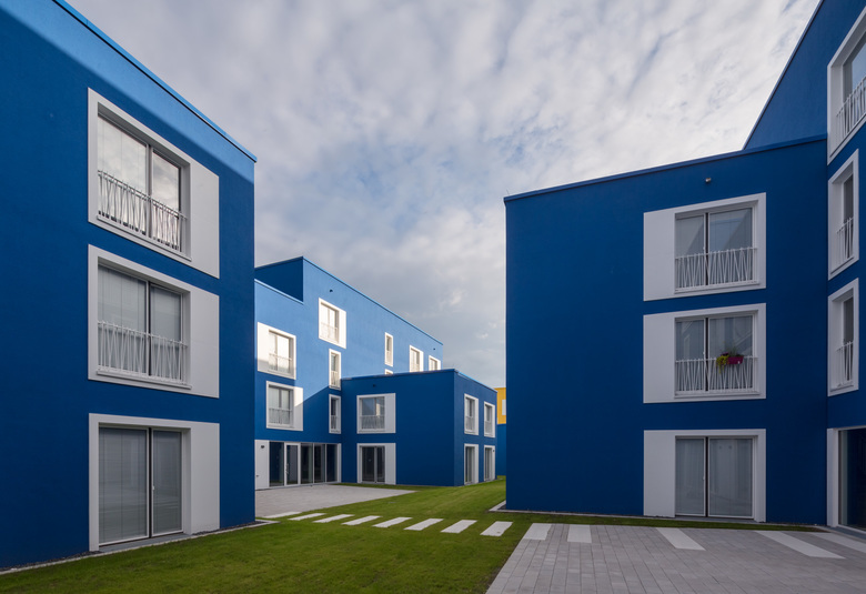 Das Studentenwohnheim ist umgeben von einer heterogenen Bebauung und besteht aus vier Solitären, die auf dem Grundstück platziert sind. Durch ihre asymmetrische Anordnung zueinander entsteht eine spannende Durchwegung,