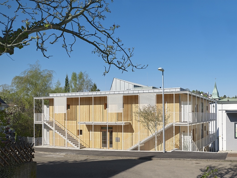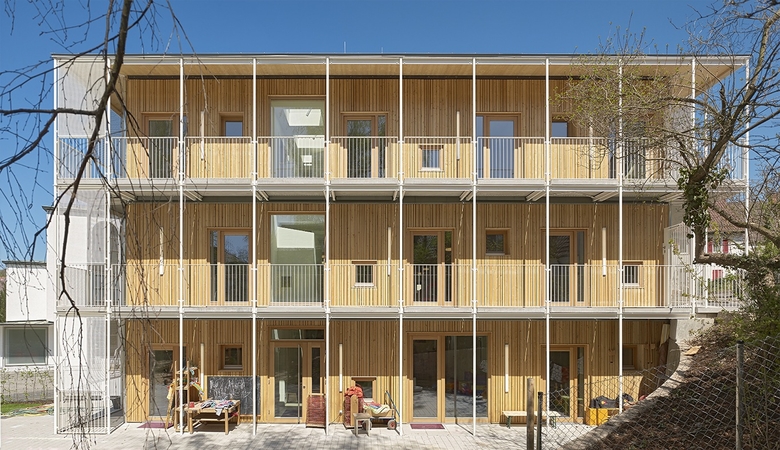 In seiner Erscheinung mag das Kinderhaus Franziskus zunächst irritieren. Kompakter Holzbau? Filigraner Stahlbau? Tatsächlich entwickelt sich diese Dualität stringent aus dem lokalen Kontext, den funktionalen Anforderungen und einer angemessenen Haltung gegenüber Energieverbrauch und Ressourcenkreisläufen.
