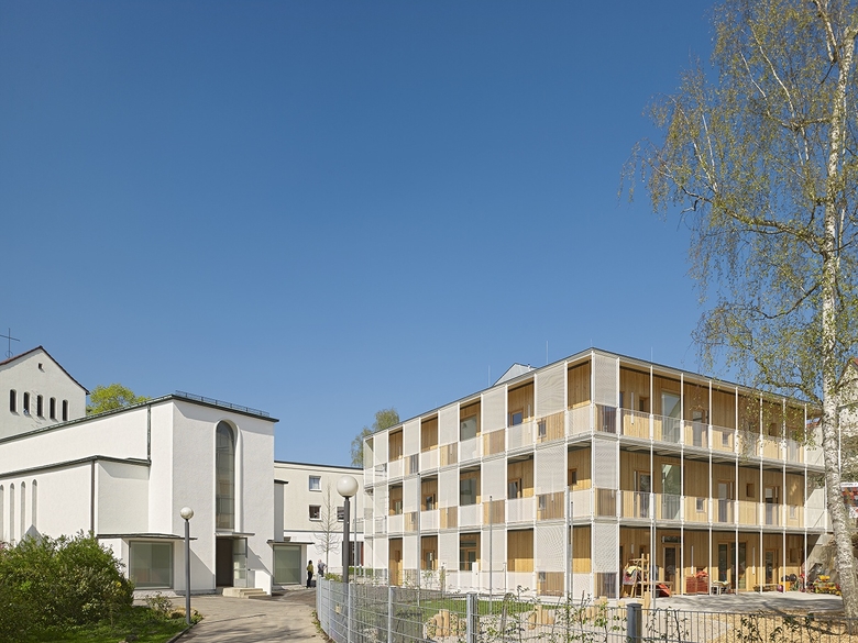 Darüberhinaus vermittelt die filigrane weiße Stahlkonstruktion zu den weißen Putzbauten der Nachbarschaft. Der Materialeinsatz des in der Herstellung energieintensiven aber bestens recycelbaren Stahls wird dabei aufs äußerste minimiert und steht im Kontrast zum flächig-massiven Holzbau. Diese umlaufende Zwischenzone ermöglicht die bewusste Engstellung und Platzbildung des Ensembles aus Kirche, Gemeinde- und neuem Kinderhaus, gewährt aber gleichzeitig eine respektierende Distanz. Die rasterartig angeordneten Streckmetallpaneele verdichten sich als Sonnenschutz entsprechend Himmelsrichtung und Sonnenstand. Zum Kirchenportal nach Westen bilden sie damit ein gleichmäßig beruhigtes Gegenüber. Mit seiner Tiefenschichtung erzeugt der Fassadenaufbau eine vielfältig wechselndes Licht- und Schattenspiel.