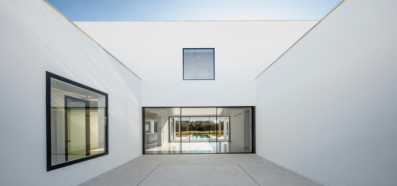 The main axis of the house is discovered from this point. Suddenly, the sequence portico, porch, courtyard, enclosed living area, courtyard, portico, pool, lake, landscape it is settled in front of the eyes of the visitor. The house live dances around this apparently static axis.