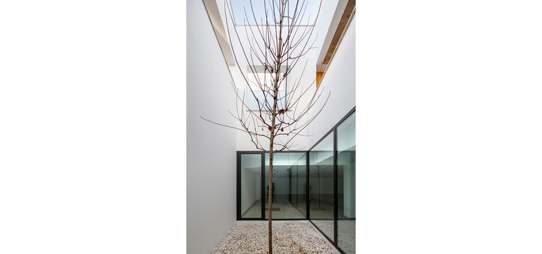 Some windows opened in the flanking walls of this sequence reveal two lateral private courtyards. These diagonal openings in the wall extend the views through the diaphragmatic structure of the main stereotomy, connecting it with the landscape.