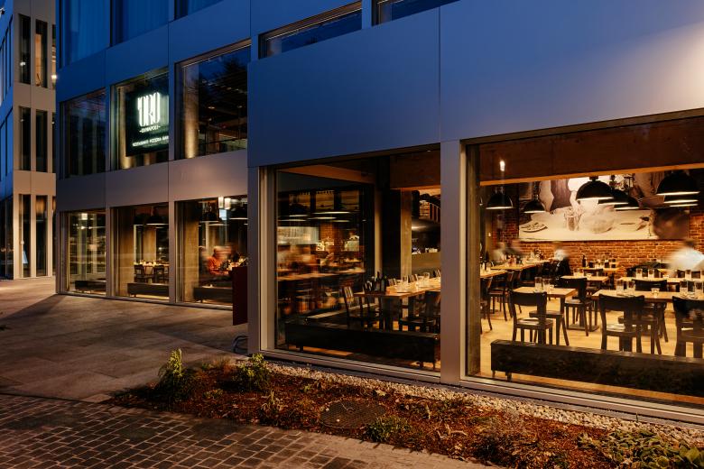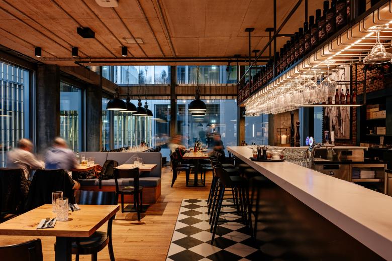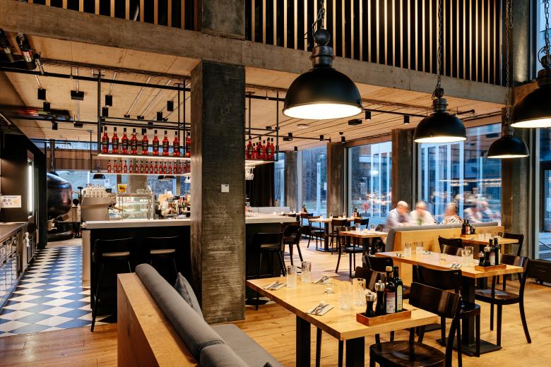 Ergänzend dazu wurden in den Bereichen mit niedrigen Betondecken Aufputz-Zylinder installiert, die zum Stil der Einrichtung passen und die Oberflächen der Tische akzentuieren. Die Laibungen der großen Fensterfronten werden abends durch Streiflicht dezent beleuchtet um auch den überhöhten Raum hervorzuheben. Das Beleuchtungskonzept wurde mit dekorativen Industriependelleuchten als Teil der Innenraumgestaltung, abgerundet.