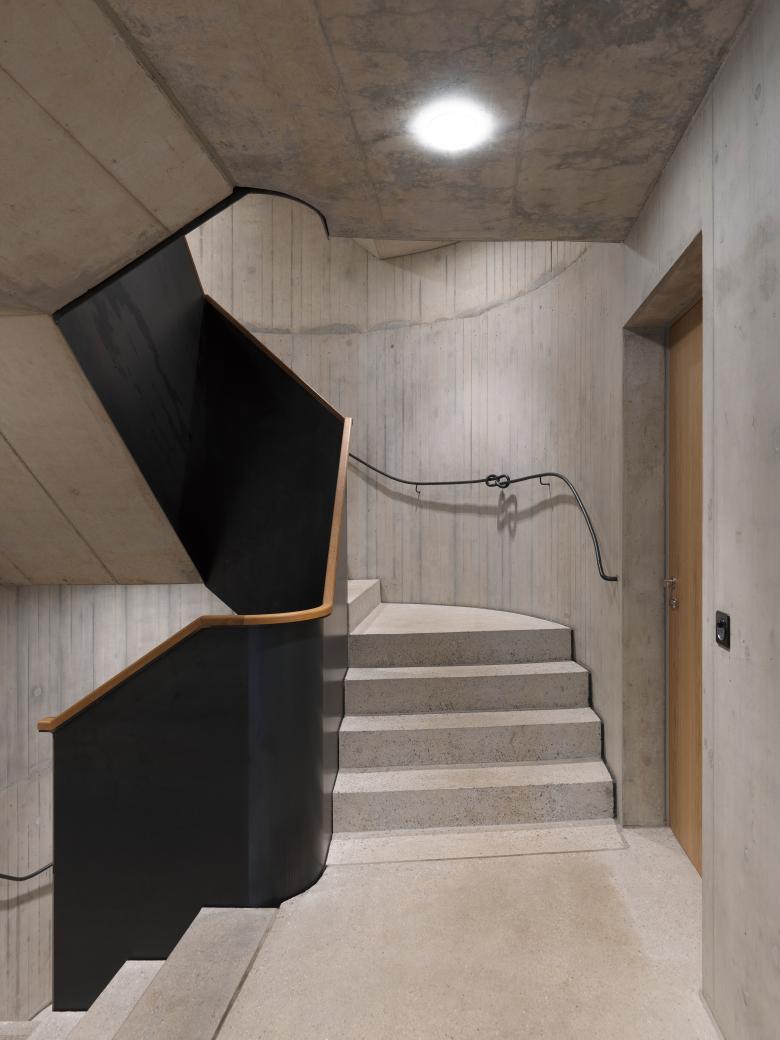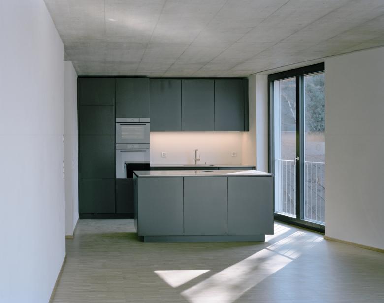 Der Ort ist geprägt durch den südlich ansteigenden Hang, welcher durch den Baumbestand und der bestehenden Gebäude die Belichtung einschränkt. Das neue Gebäude nimmt auf diese speziellen Umstände Rücksicht indem es sich weich geformt in die Situation einpasst und sich zu den freien Bereichen der Parzelle öffnet. Das Gebäude verzahnt sich so mit den Bäumen als prägende Elemente des Ortes und schafft dadurch differenzierte Ausrichtungen, welche die notwendige Privatheit für die einzelnen Wohnungen anbieten. Die konkaven Terrassenstrukturen bieten grossartige Aussenräume, welche die Wohnräume nach aussen tragen und deren Grosszügigkeit befördern.