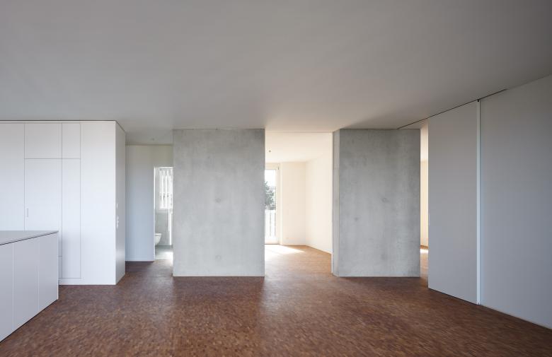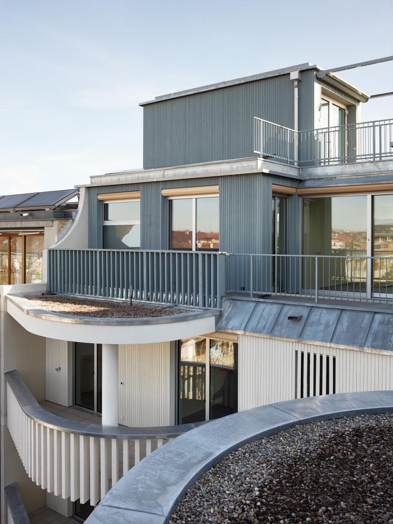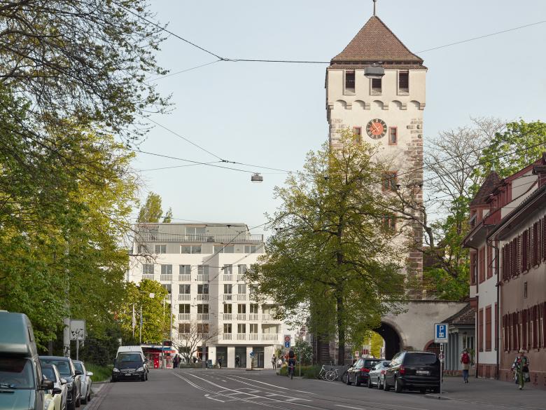 Das vorliegende Projekt markiert die nördliche Ecke des St. Johann-Platzes im Übergang zur Elsässerstrasse und zum St. Johann-Park. Diese städtebaulich wichtige Ecke im Gründerzeit-Blockrand wird über einen differenziert gegliederten Baukörper mit einem präzise gesetzten auskragenden Erker besetzt. Auf der Strassenseite zeigt sich der helle Baukörper als mineralisches Volumen, während er am Dach und im Hof als gegliedertes holzverkleideter Körper in Erscheinung tritt. Die französischen Fenster sind zur Strassenseite über kräftige Geländer charakterisiert und hölzerne Storen zeichnen die gut propotionierten Öffnungen zusätzlich aus, während auf der Hofseite plastisch entwickelte Balkone die besondere innenliegende Ecksituation auszeichnen. Die insgesamt 14 Wohnungen werden durch eine Espressobar und ein Wohnatelier im Erdgeschoss ergänzt, welche mit ihren Nutzungen den Anschluss an den öffentlichen Raum leisten.