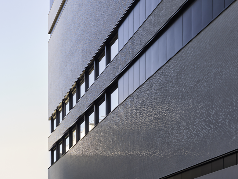 Der Bau 41 auf dem Roche Areal in Basel, ein Lager- und Logistikgebäude, von Roland Rohn entworfen und mehrfach angebaut, wird um ein automatisiertes Hochregallager aufgestockt. Die Erweiterung wird dazu benutzt, das im Grundriss leicht gestaffelte Volumen mit einer neuen Gebäudehülle zu vereinheitlichen, und ihm damit eine stärkere Präsenz zu verleihen und den aktuellen Energiegesetzen entspricht. Gleichzeitig nimmt die Zone zwischen Bestand und neuer Fassade die zusätzlich benötigten Vertikalelemente auf. Die weissen Fassaden über hellem Betonsockel, in Glaskeramik unterschiedlichen Glanzgrades materialisiert, werden durch vier schmale, leicht zurückversetzte und dunkel erscheinende horizontale Bänder gegliedert, welche die Fenster der Bürogeschosse umfassen, die Fuge von alt und neu artikulieren oder, wie im obersten Streifen, technisch bedingt sind. Die Bänderung des elegant proportionierten, nunmehr 40m hohen Gebäudes mit seinen Hell-Dunkel-Kontrasten, führt das Erscheinungsbild der Roche Bauten auf ebenso selbstverständliche wie eigenständige Weise fort.