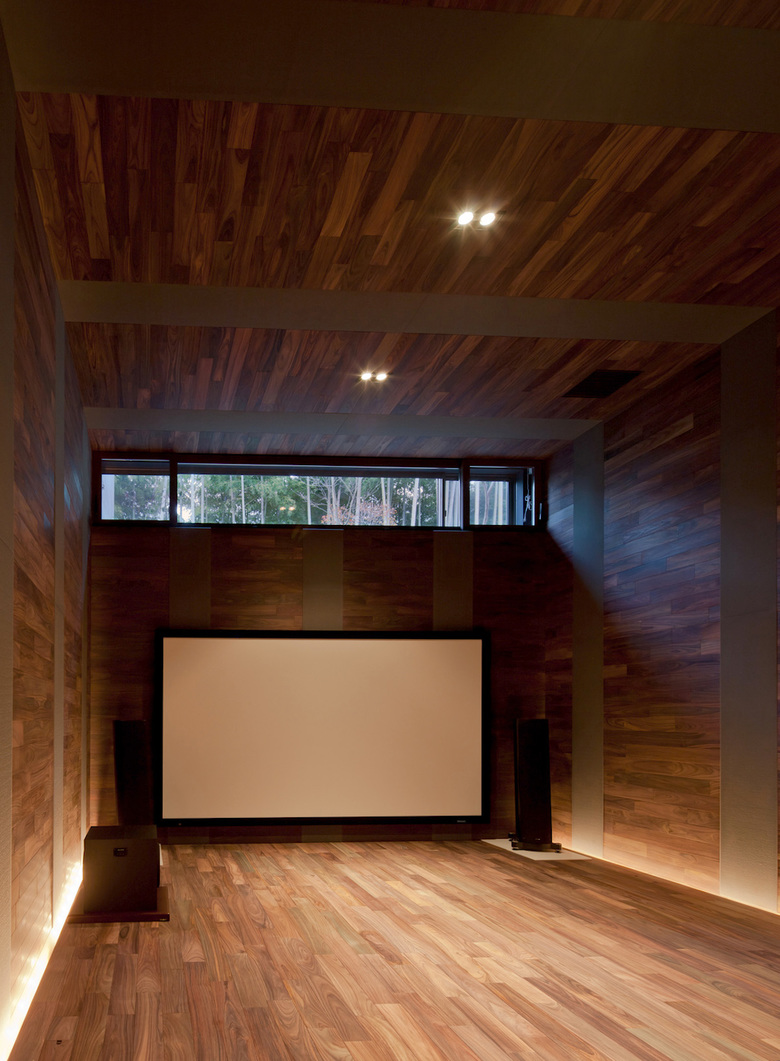 Using the difference of ups and downs by which the 1st floor of underground is bumboobush, a garage and the theater room which is family's hobby were distributed and it was made a real Ishii system theater room. Bumboobush on the north side can enjoy itself from a high window in the room and they seem to be in a theater at all.