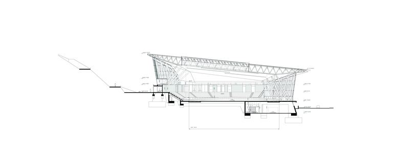 L'adaptació a la topografia es posa de manifest tant en la secció longitudinal com en la transversal. Mitjançant unes mínimes excavacions i moviments de terra, es va crear una estructura que s'adapta a les dues seccions, emfatitzant la relació entre topografia, paisatge i edifici.