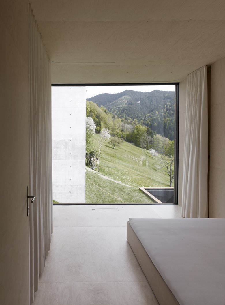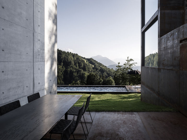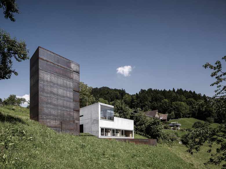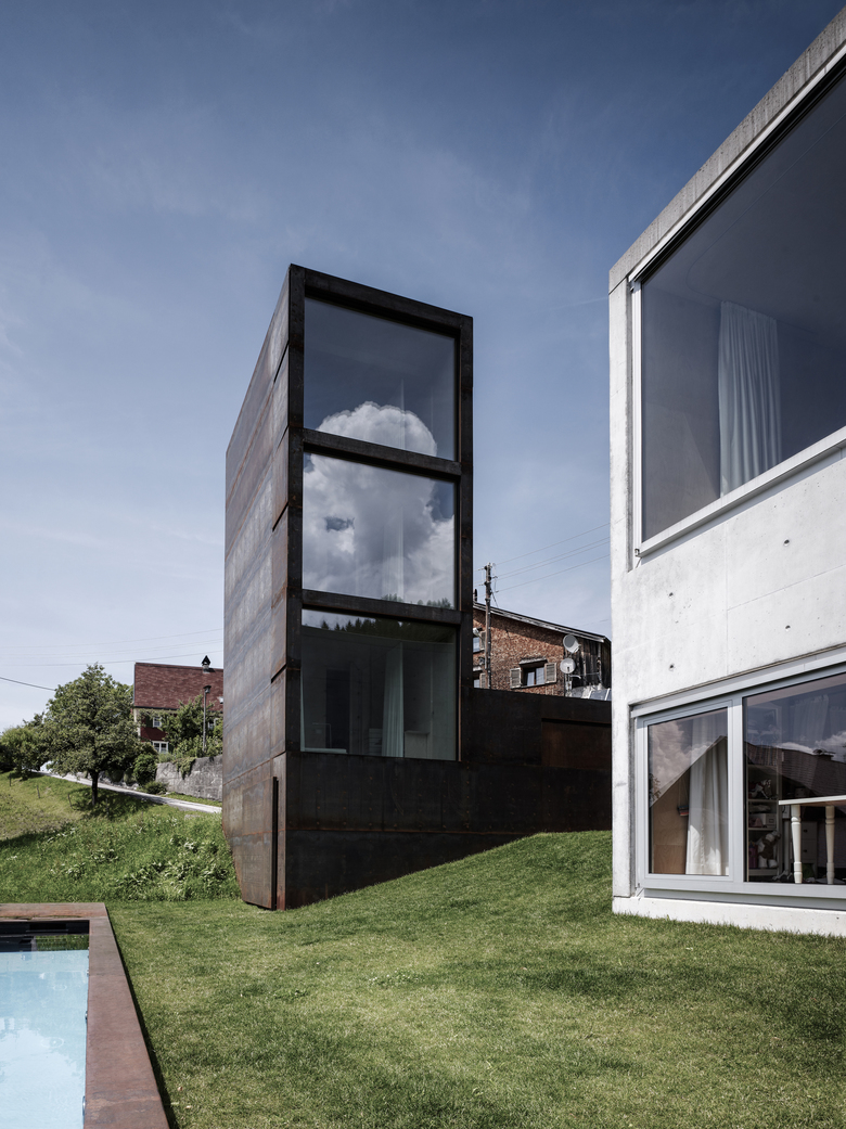 Was war der wuchtigen Erscheinung des Haus Marte in Beton, diesem rohen, steinernen Material, entgegen zu halten, was der in sich geschlossenen Form? Oxidierender Stahl: Ebenso roh, ebenso wahrhaftig in seinem Ausdruck und seinem Verhalten. Die innere Anmutung bleibt die gleiche - hölzern, warmtonig, feinporig. Die neue äußere Gestalt hingegen maskulin, aufstrebend, sich aus dem Terrain erhebend, dem nahe stehenden Birnbaum gleich. Dass sich dahinter ein Leichtbau befindet, mag einer trojanischen Finte entstammen. Dazwischen spannt sich ein neuer Raum auf, ergänzt durch einen in die Erde gedrückten Pool – kompromisslos, hart, wenig vernunftbetont, dafür märchenhaft, eigensinnig und sinnlich. Oxidierender Stahl an Boden und Wänden, hermetisch wie eine Ritterrüstung. So erscheint auch der Turm mit seinen stählernen Lüftungsklappen gen Süden und Norden, den Fixverglasungen nach Osten. Rapunzel, Rapunzel…. Über die Bibliothek, ein paar Stufen hinab in die eigenständige Küche und den dem Pool vorgelagerten Essraum, entschwinden die Prinzessinnen mittels Wendeltreppe in ihre Gemächer. Dort eröffnen sich ihrem Sichtfeld zum einen das schützende Elternhaus, zum anderen der reizvolle angrenzende Wald. Orientierung und Freiheit spiegeln sich in der Raumperspektive, ein Sinnbild ihrer innerfamiliären Entwicklungsmöglichkeiten.