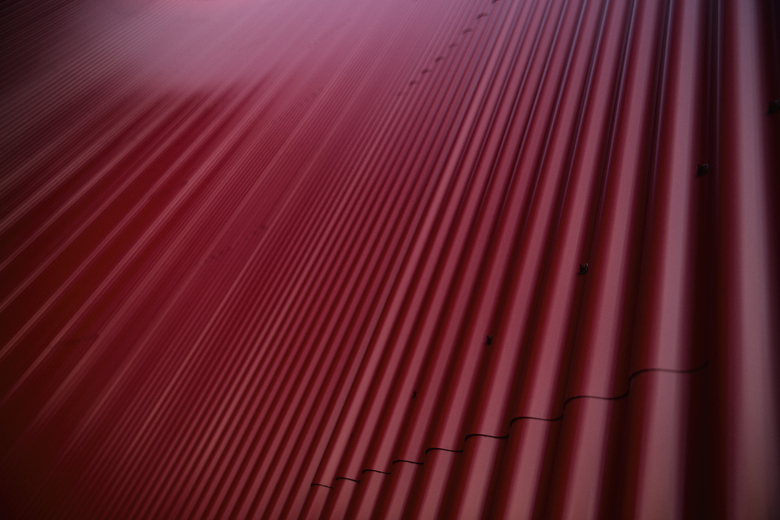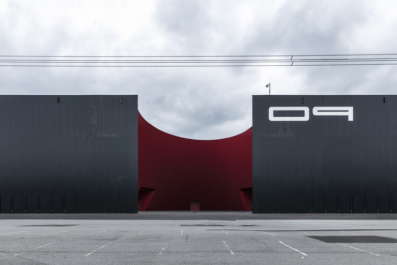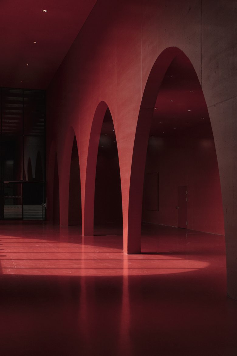Das Rückgrat bildet die innere Erschließungsachse – raumhohe verglaste Öffnungen leiten durch die Abfolge der Hallen – Rot, Schwarz, Rot, Schwarz. So einprägsam die elliptischen, hyperbolischen Einschnitte an den beiden Längsflanken sind, so eindringlich ist auch die Farbgebung des Riesen - satte, reine Farben ohne Abschattierungen wie in der Heraldik.
