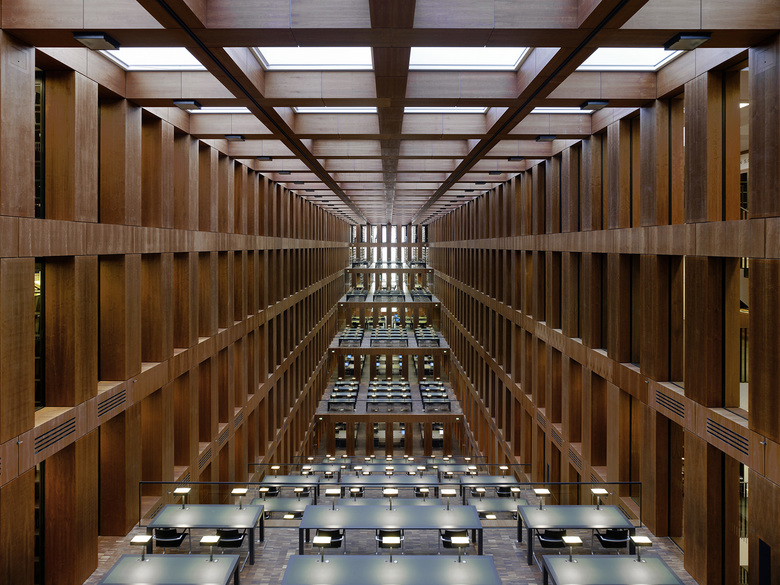 Das Grimm-Zentrum der Humboldt-Universität zu Berlin ist die größte Freihandbibliothek Deutschlands. Um die Bedeutung der Bibliothek städtebaulich zu markieren überragt ein Teil des Gebäudes die typische Berliner Traufkante. Wie ein kubischer Wissensspeicher reiht sich das Haus in die städtische Silhouette der nahen Museumsinsel ein. Um ein Entree für die Bibliothek zu schaffen, wurde das Gewebe der Berliner Dorotheenstadt durch einen vorgelagerten Stadtplatz längs des S-Bahn-Viadukts bereichert. Von den treppenartigen Terrassen des zentralen Lesesaals aus sind alle 2,5 Millionen Medieneinheiten zu erreichen: Ein zentraler Raum, der auch dezentrales Arbeiten ermöglicht. Im humboldtschen Sinne werden in der Bibliothek Wissensgebiete zusammengeführt - und zugleich die Besucher angeregt, die Grenzen dieser Gebiete im wahrsten Sinne des Wortes zu überschreiten.