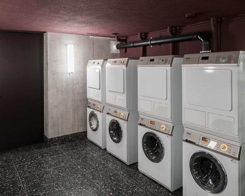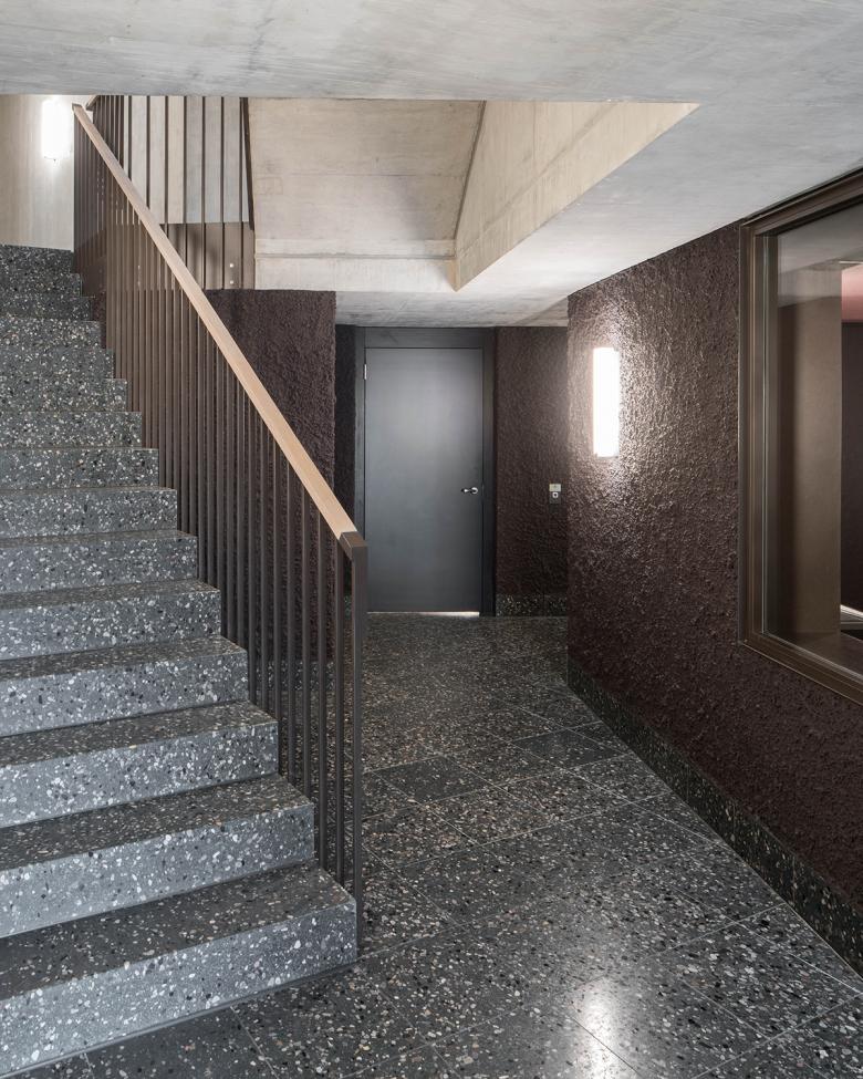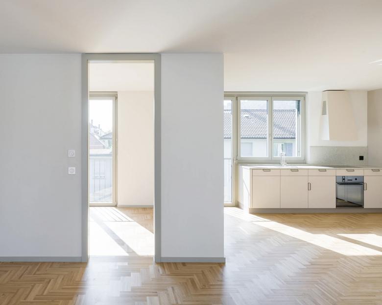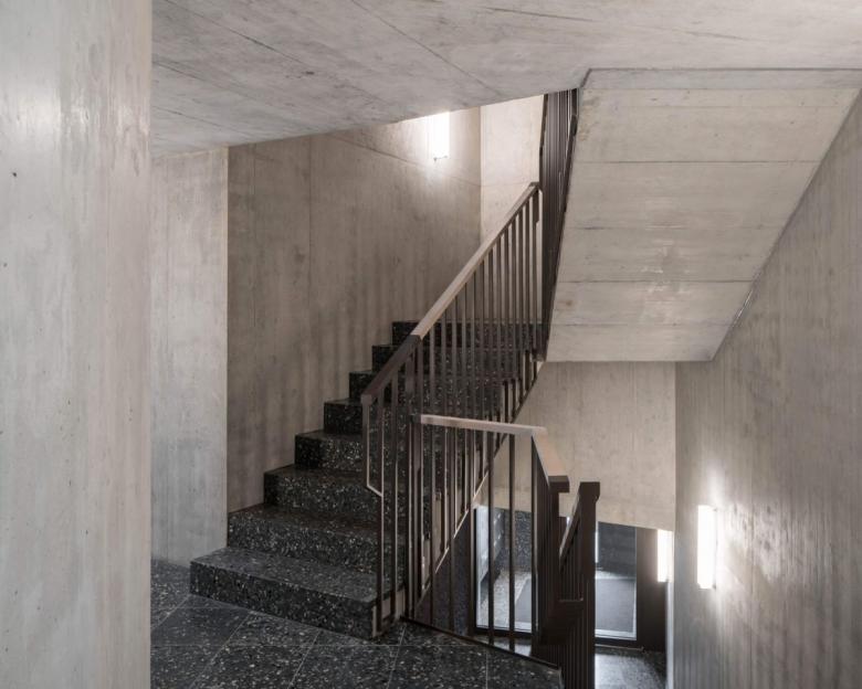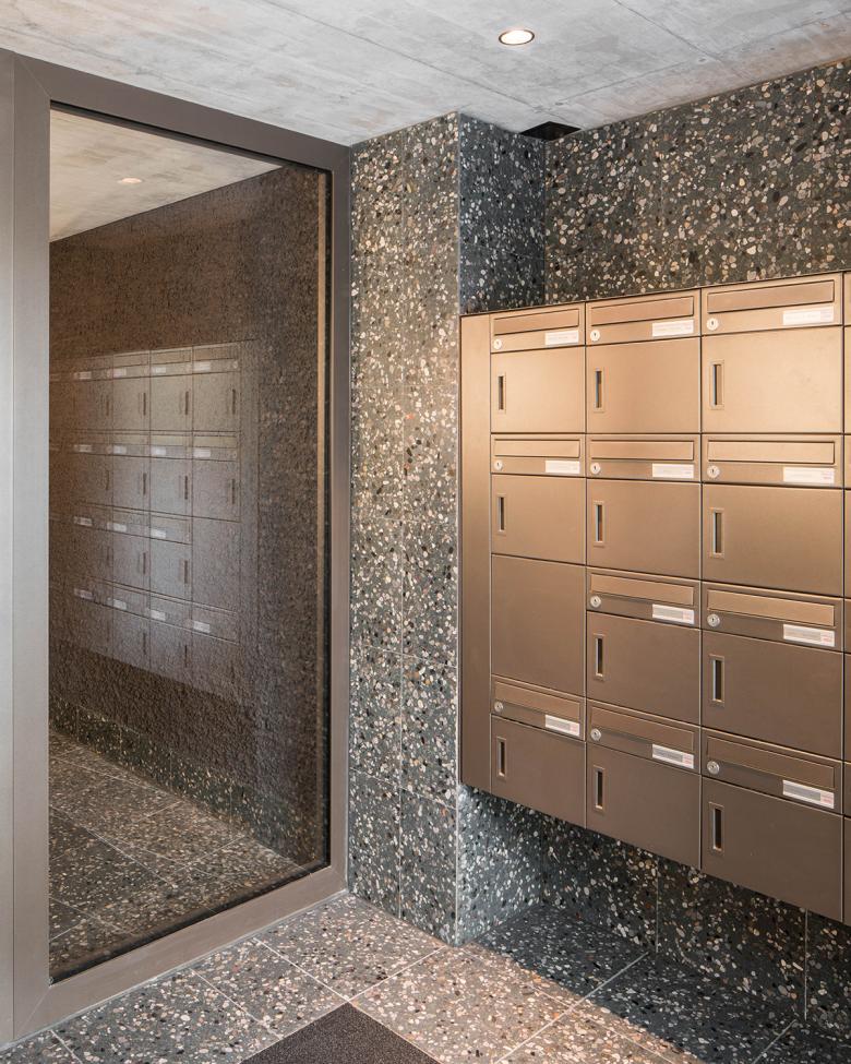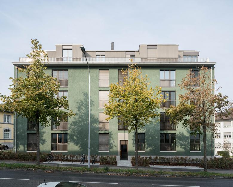 Das Gebäude überlagert die heterogene Bebauungsstruktur des Gevierts mit Blockrand-, Zeilen- und Punktbauten und überschreibt diese in seine Typologie. Daraus entsteht eine mehrschichtige, janusköpfige Architektur, die mit feinen architektonischen Nuancen ihren Ausdruck und ihre Räume entsprechend ihrer Lage variiert. Zwei Volumen folgen dem jeweiligen Strassenlauf und verschmelzen als facettierte Gebäudefront mit Erker und Eingangsportal an der Weggabelung. Ein filigranes Vordach, ein farbiger, grober Verputz und eine strenge Gliederung der französischen Fenster prägen die repräsentative, strassenseitige Erscheinung. Im Süden öffnet sich die Figur zum angrenzenden Hofraum und schafft mit Loggien eine, dem Lärm ab- und dem Garten zugewandte, hohe Wohnqualität. Die Wohnungen entwickeln sich vom zentralen Treppenhaus in die dreiseitig orientierten Gebäudeenden und profitieren so von den städtischen und suburbanen Qualitäten des Ortes.
