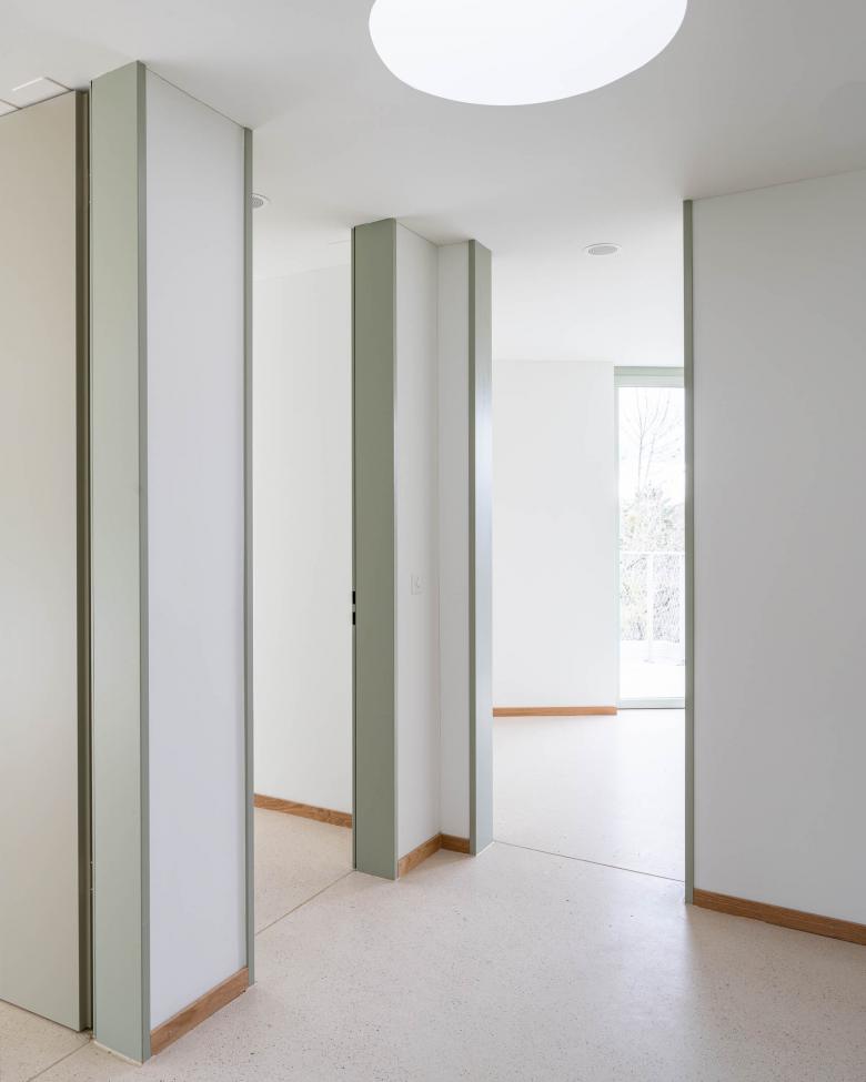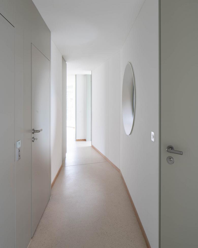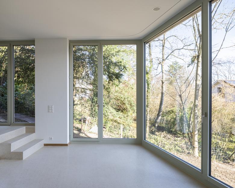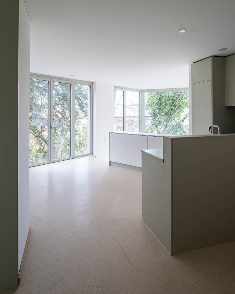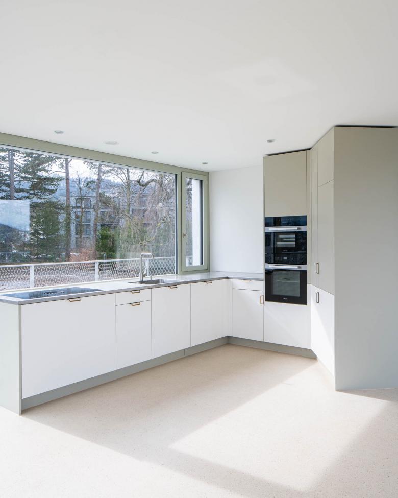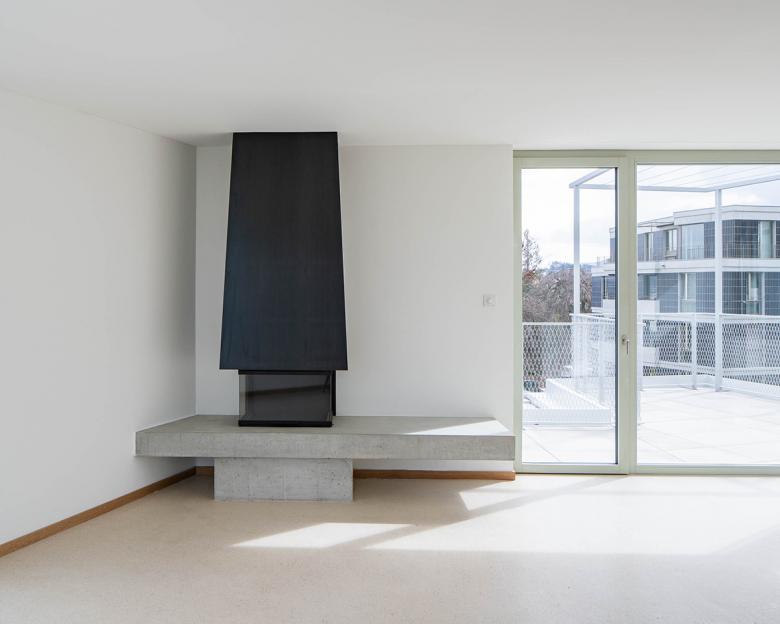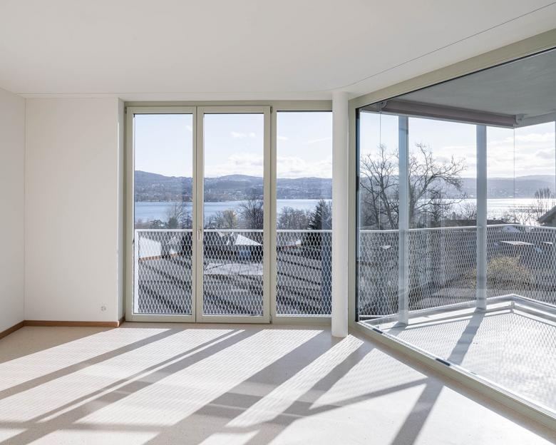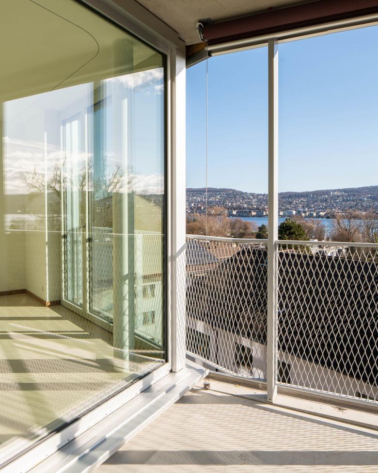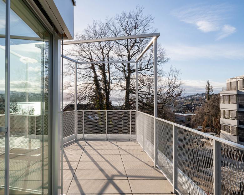 Wie das Relikt einer Schanze schmiegt sich das Haus an die Wölbung des Bellariarains und fächert sich anmutig zur Seesicht auf. Hangseitig betritt man die Hausnummer 5 ebenerdig im zweiten Obergeschoss. Eine verwinkelte, dreiläufige Treppe führt durch das als Zweispänner konzipierte Haus. Die beinahe symmetrisch aufgebauten Wohnungen werden über ein Entrée betreten, das zugleich als Verteiler für Zimmer und Bad fungiert. Dem Lichteinfall folgend, gelangt man in den grosszügigen, polygonalen Wohn- und Essbereich. Eine offene Erkerküche, dreischenklig wie die Treppe, bildet zusammen mit der Loggia den Abschluss der Wohnungen. Die Vor- und Rücksprünge in der Silhouette des Hauses schaffen spannungsvolle Innenräume und eröffnen einen mehrseitigen Aussenraumbezug für sämtliche Wohnungen. Übereinander liegende, raumspezifische Öffnungen sowie die gerippte Metallverkleidung der geschlossenen Bereiche verleihen der Fassade eine vertikale Betonung. Zusammen mit der verwinkelten Segmentierung der Fassadenabwicklung wird so eine verspielte und schlanke Wahrnehmung erreicht, die das Barock anmutende Volumen kontrastiert.