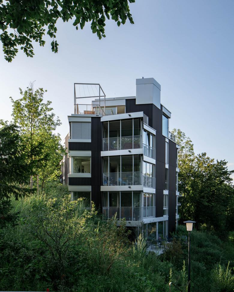 An der Flanke des Moränenhügels, der in Wollishofen den Zürichsee begleitet, steht das Mehrfamilienhaus am Belt Walk in direkter Nachbarschaft zur Siedlung Bellariarain. Die exponierte Lage am abschüssigen Terrain und der daraus resultierende Blick auf den Zürichsee sind prägend für den Ersatzneubau, der aus einem Studienauftrag 2014 hervorging und dessen acht Wohnungen 2021 bezogen wurden.