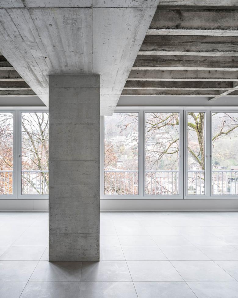 Kern des Entwurfs ist eine Enfilade aus Sottoportegos – öffentlichen Durchwegungen im Erdgeschoss – welche das Rückgrat der vier Volumen bildet und die Erschliessung anbindet. Die Treppenhäuser liegen neu im Bauch des Gebäudes und steifen die von effizientem Materialeinsatz geprägte Substanz aus. Das Thema der Enfilade setzt sich in den grosszügigen Wohnungen fort und auch die statisch notwendigen Eingriffe an der betonierten Kassettendecke manifestieren sich in Form massiver, raumgliedernder Stützen und Wohnungstrennwänden. Als Kontrast windet sich eine filigrane, schürzenartige Fassade mit einem dynamischen Ballett aus textilen Ausstellmarkisen um die Gebäude und bringt etwas vom alten Glanz zurück. Dank dem Erhalt der Gebäudestruktur besteht der ortsspezifische Bezug zum Flussraum weiter und ein nahtloses Kapitel in der Stadtentwicklung Badens wurde fortgeschrieben.
