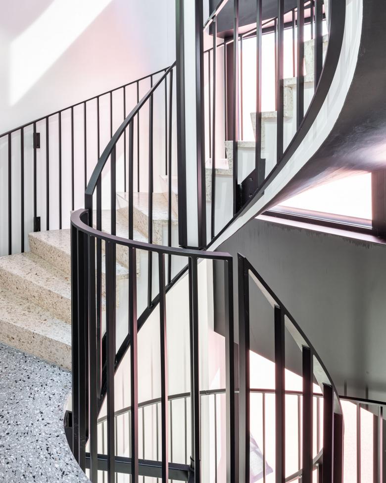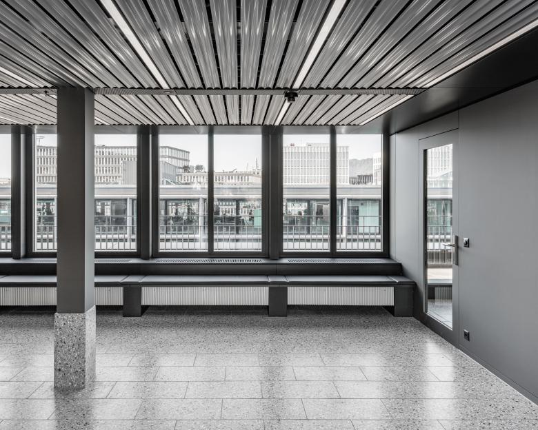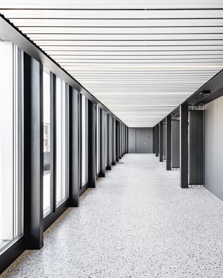 Als Rochadefläche für die Büroflächen der kantonalen Behörden vorgesehen, haben die Räumlichkeiten hohen Ansprüchen bezüglich Flexibilität der Raumaufteilung und des Gebrauchs zu erfüllen. Entsprechend weit ist die geplante Nutzungsvielfalt und eng das damit einhergehende Gebäuderaster, welches diese ermöglicht. Sowohl im Grundriss als auch an der Gliederung der Fassade wird diese zentrale Anforderung an das Gebäude ablesbar. Während die Innenräume um einen Infrastrukturkern angeordnet sind, um unterschiedliche Zonierungen entlang der Fassade zu ermöglichen, bildet diese mit Lisenen aus Aluminium die innenräumliche Gliederung als vertikales Element ab. Analog einem eleganten schwarzen Kleid hüllen sich die Brüstungen in Palissandro Nero. Dieser wird zum einen poliert, flächig eingesetzt, um ein horizontales Gleichgewicht zu den Lisenen zu kreieren, zum anderen wirkt er durch den gefrästen und profilierten Bereich spielerisch, leicht und textil.