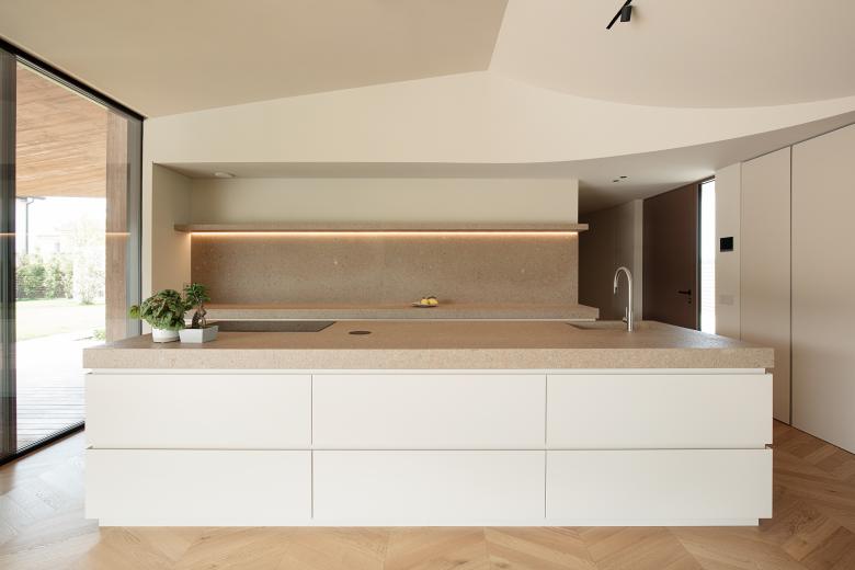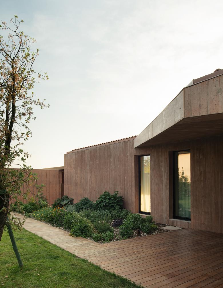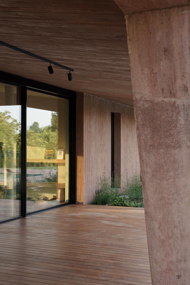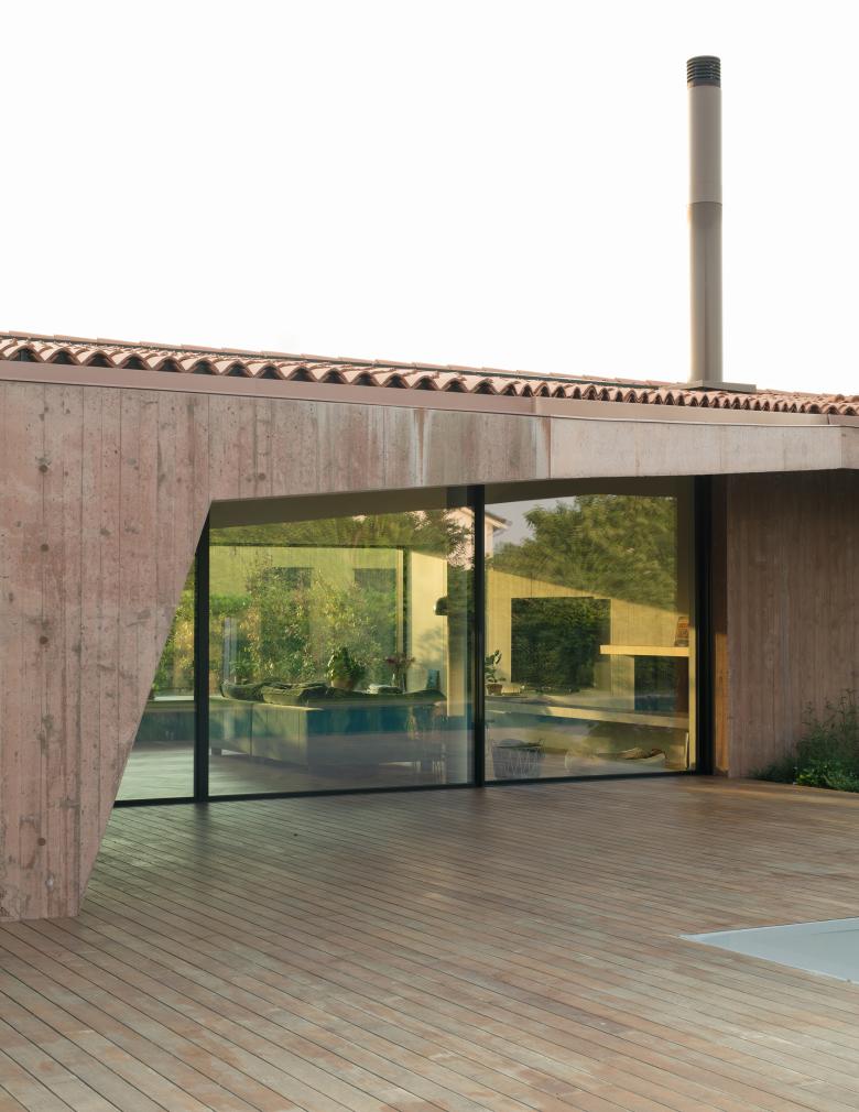 Al fine di creare un portico di connessione tra la zona living e la piscina, la falda di copertura subisce una dilatazione controllata, seguendo la sua inclinazione naturale.