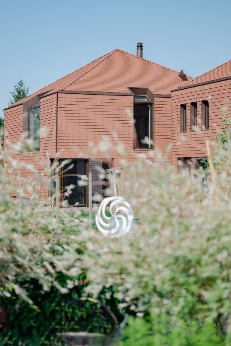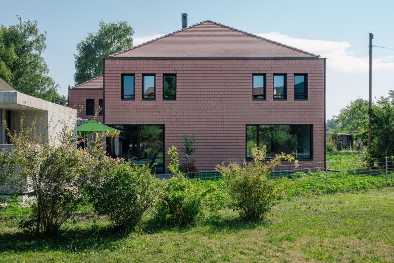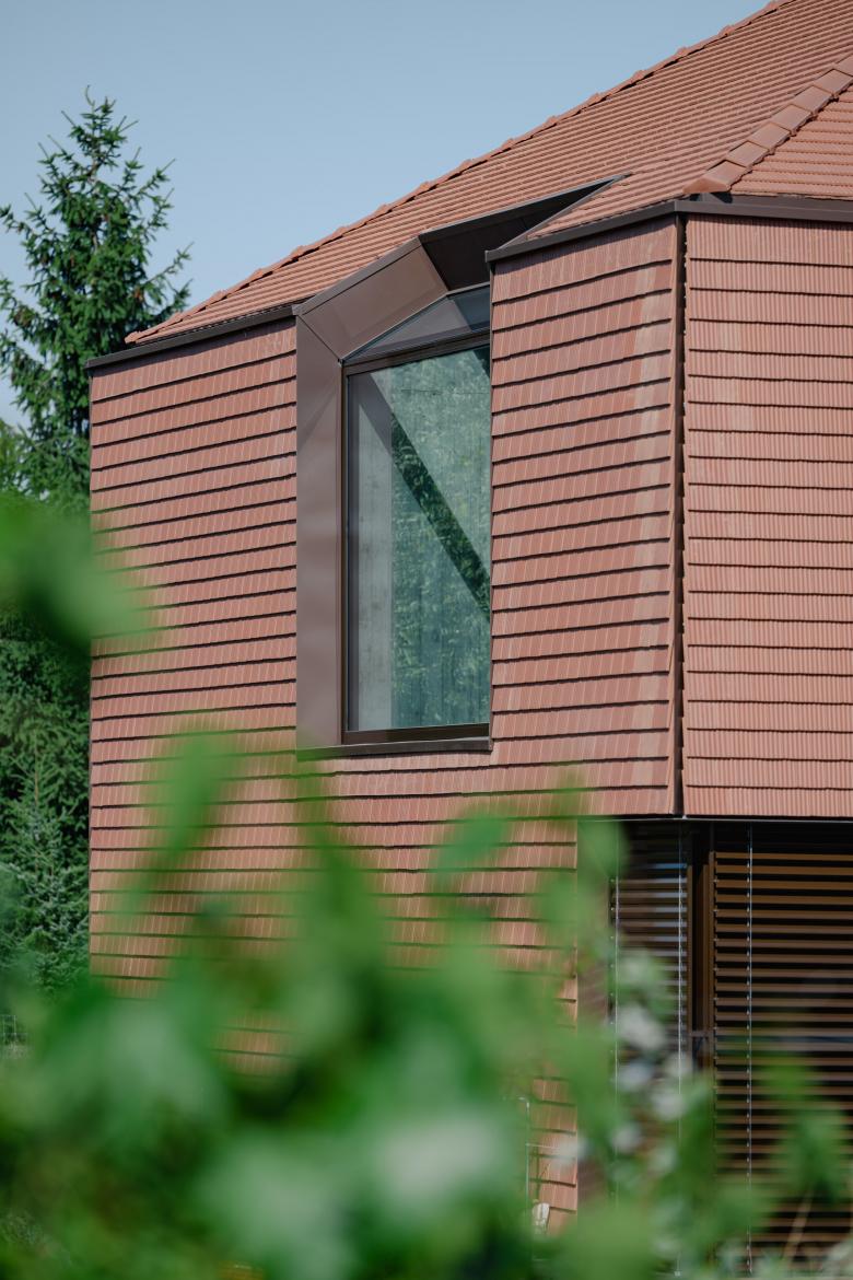 Das Einfamilienhaus-Ensemble in Diessenhofen besteht aus zwei quadratischen Gebäuden, die unmittelbar neben der Altstadt Diessenhofen stehen. Die Häuser sind jeweils mit einem Zeltdach ausgestattet, das für eine harmonische Optik sorgt. Die besondere Eigenschaft der Gebäudehülle ist die Verwendung von Biberschwanz-Ziegeln sowohl auf dem Dach als auch an den Fassaden. Dieses Gestaltungselement wurde bewusst gewählt, um eine harmonische Verbindung zwischen den Neubauten und der Altstadt zu schaffen.