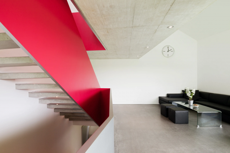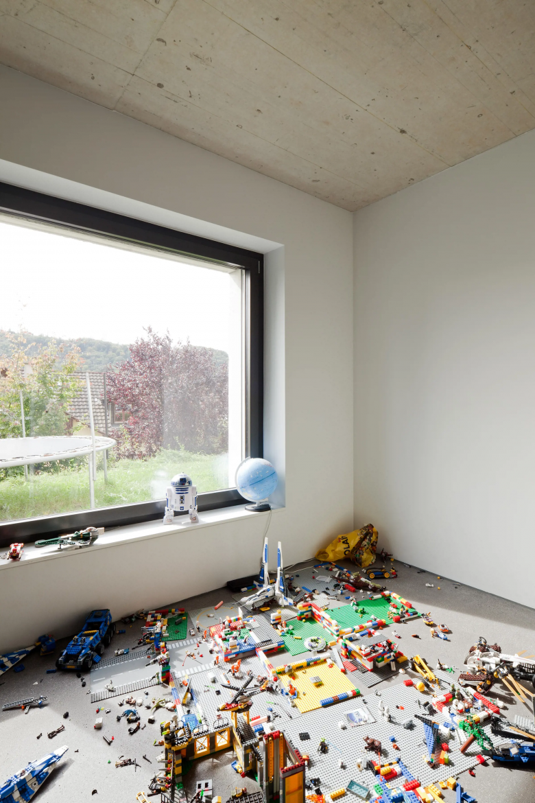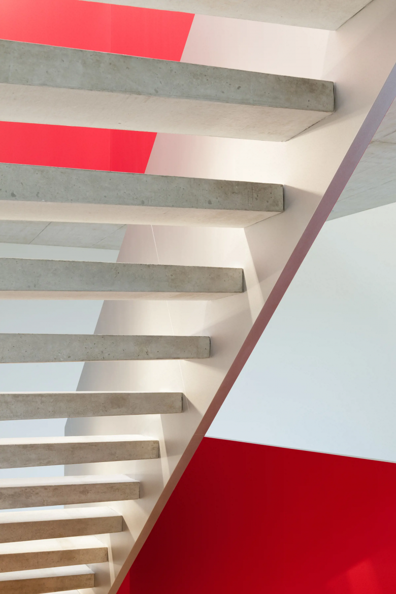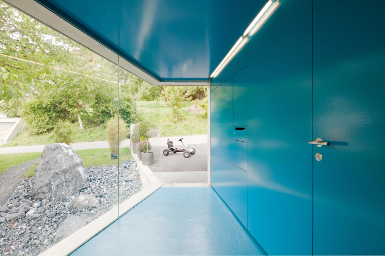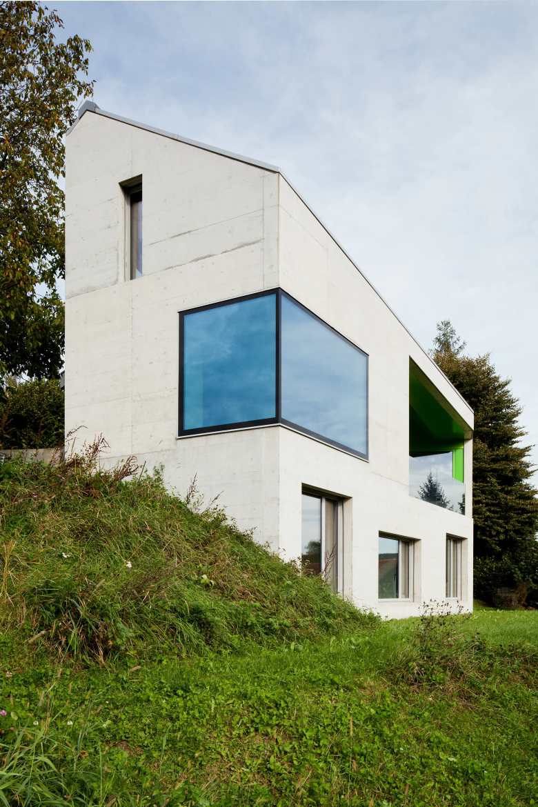 Wie ein Fels thront der monolithische Baukörper am Hang und weist seiner Terrasse den Platz vor dem bestehenden Nussbaum zu. Von der Strasse her betritt man das Gebäude über das Obergeschoss, und über die Treppe, die sich als rotes Band durch das Haus zieht, gelangt man in die beiden Wohnebenen. Die überhohe Loggia schafft interessante Durchblicke und Raumbeziehungen.