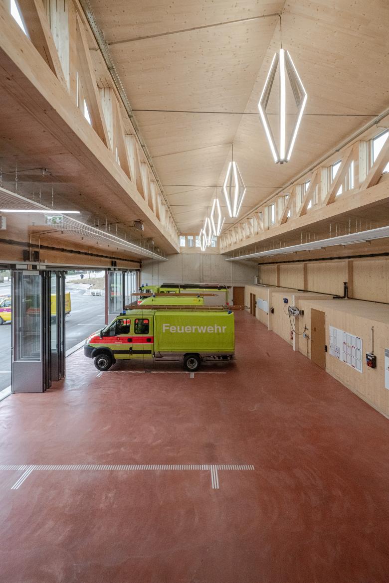 Das Feuerwehrdepot wurde winkelförmig gestaltet, um sich gut in die örtliche Situation einzufügen und optimale Funktionsabläufe auf einem begrenzten Baugrund sicherzustellen. Die Aufteilung der Fahrzeughalle ermöglicht eine effiziente Nutzung des Vorplatzes. Der Gebäudeschenkel zur Strasse hin entflechtet die einrückenden Feuerwehrpersonen von den wegfahrenden Einsatzfahrzeugen und minimiert die Einrückungswege.