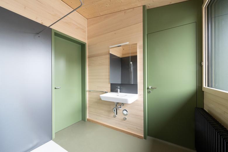 Das Gebäude fügt sich dank seiner Architektursprache gut in den Ortskern ein und schafft einen sanften Übergang zur Landschaft. Die Farbgebung wurde aufgrund einer Analyse der umliegenden Gebäude ausgewählt.