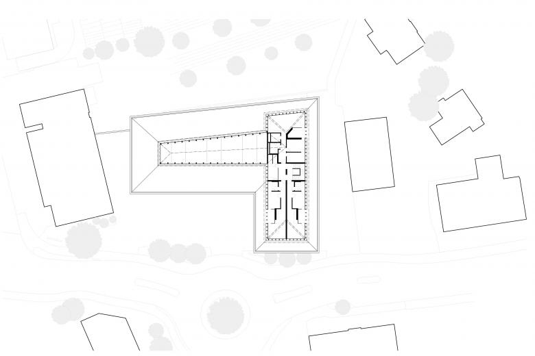 Ein weiteres Ziel des Entwurfs war es, dass das Depot als öffentliches Gebäude wahrgenommen wird. Die Dachkrone, die sich über dem Hauptdach befindet, integriert zum einen die zurückgesetzte Wohnnutzung und bindet zum anderen den großen Fachwerkträger, der die Halle in Längsrichtung überspannt, gut ein.