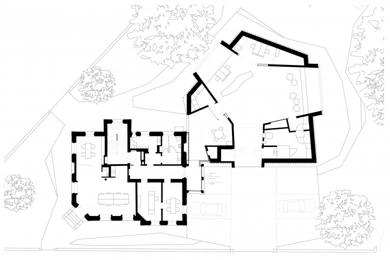 Der eingeschossige Neubau mit zentraler Kundenhalle fügt sich unaufdringlich in die Umgebung ein und wird teilweise von Kletterrosen bewachsen. Lediglich das Dach der Kundenhalle ragt über die Bepflanzung hinaus und ist aus einem anderen Material gefertigt. Die beiden großen Fenster in der Kundenhalle sind schräg nach oben gerichtet, um den Blick aus dem Inneren in die umliegenden Parkbäume zu lenken.
