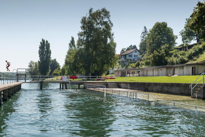 Die Sanierung mit Erweiterung der Rhybadi Diessenhofen wurde in zwei Etappen ausgeführt: In der ersten wurde das Schwimmbecken saniert und mit einem Plantschbecken und einer Liege aufgewertet. Die Pooltechnik wurde erneuert und wird nun täglich neu mit Rheinwasser gefüllt. In der zweiten Etappe wurde der längliche schlichte Holzbau aus der Nachkriegszeit mit seinem historischen Ambiente teilweise saniert und erweitert. Der Bau wurde mit einem gedeckten Sitzplatz und einem neuen Gastroteil mit Kühl- und Gefrierzelle im ursprünglichen Stil ergänzt.