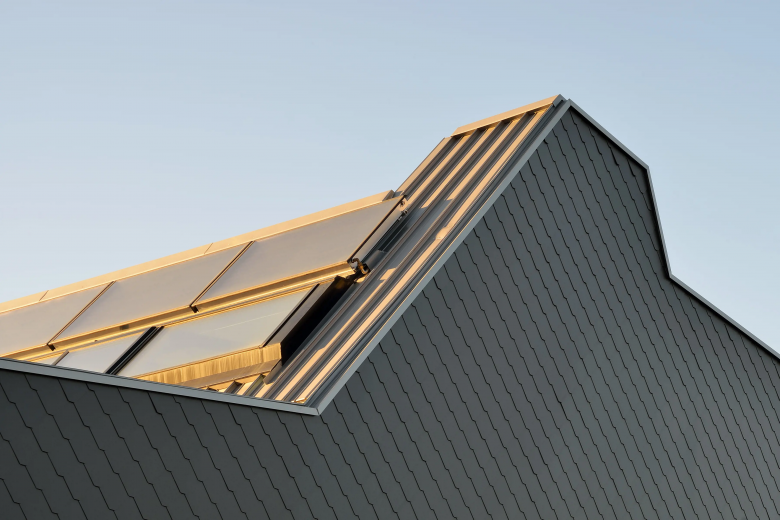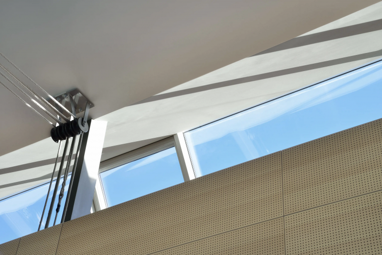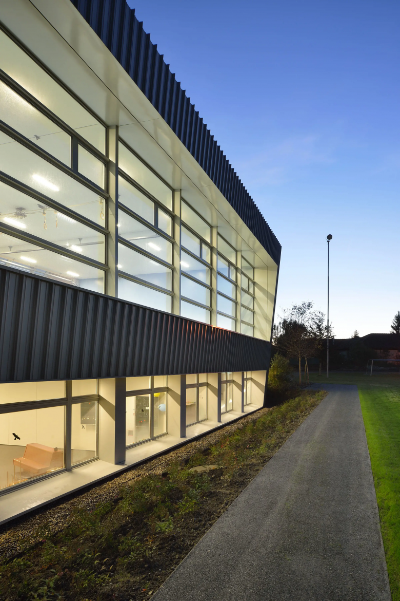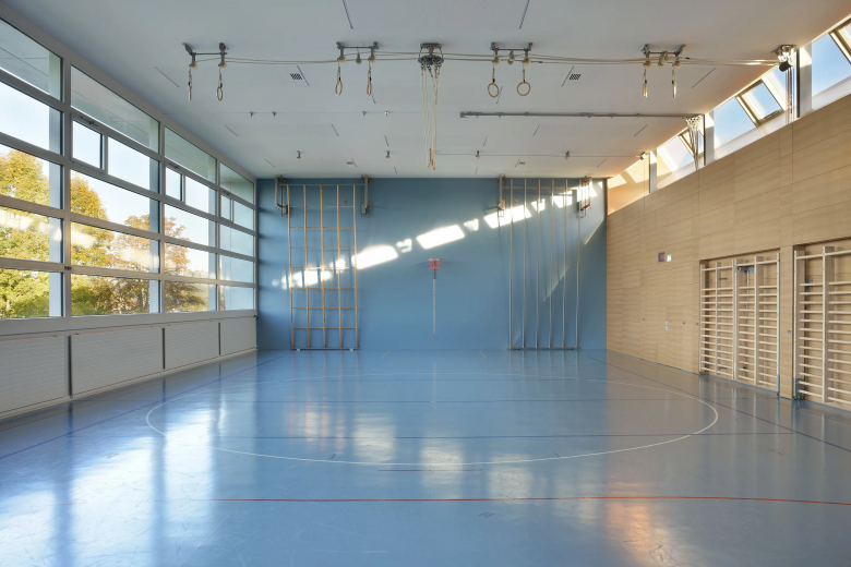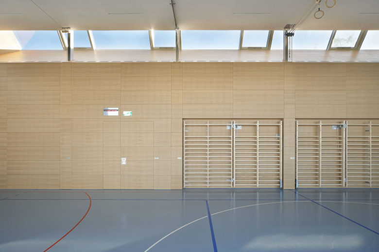Das Primarschulhaus in Basadingen aus dem Jahr 1969 grenzt an einen erhaltenswerten Schulbau aus dem 19. Jahrhundert. Die maroden Flachdächer eines Zwischentrakts und der Turnhalle wurden zu Schrägdächern ausgebaut, um geschickt die kontrollierte Lüftung mit Wärmerückgewinnung für die Garderoben aufzunehmen. Die Dach- und Fassadenverkleidung wurde mit durchgehenden Aluminiumprofilen als zusammenhängendes Band neugestaltet. Zur Einbettung in die ländliche Umgebung wurde an den Giebelfassaden Eternitwaben verwendet.