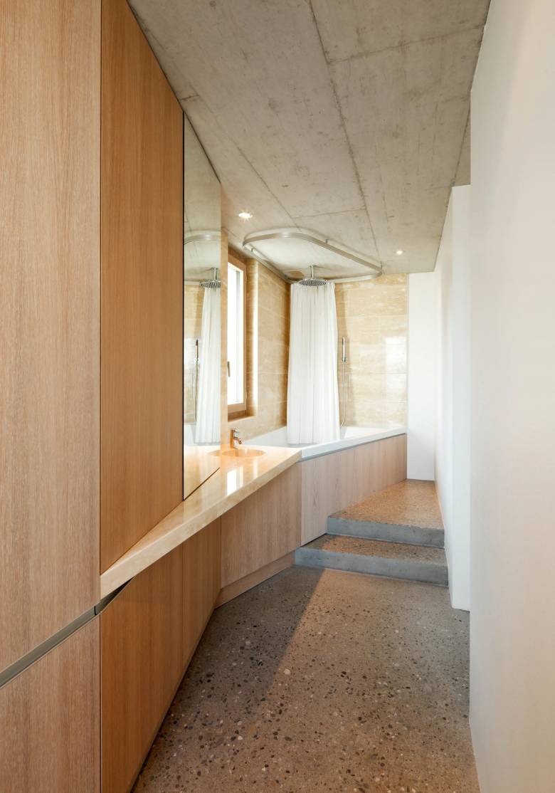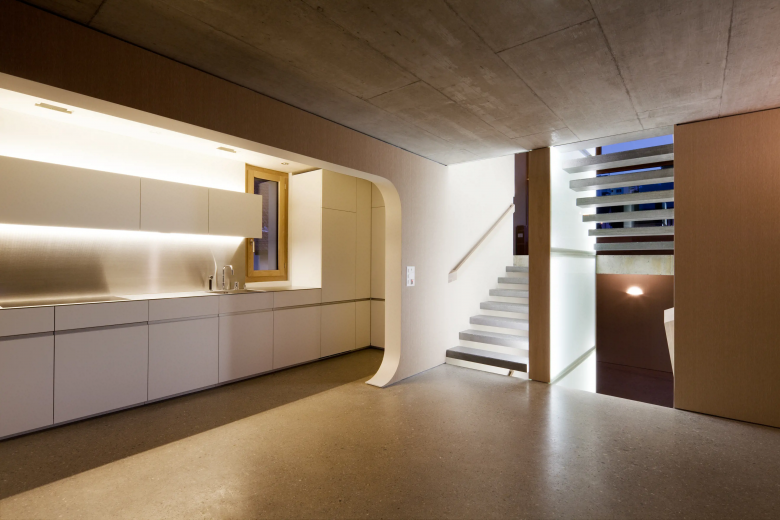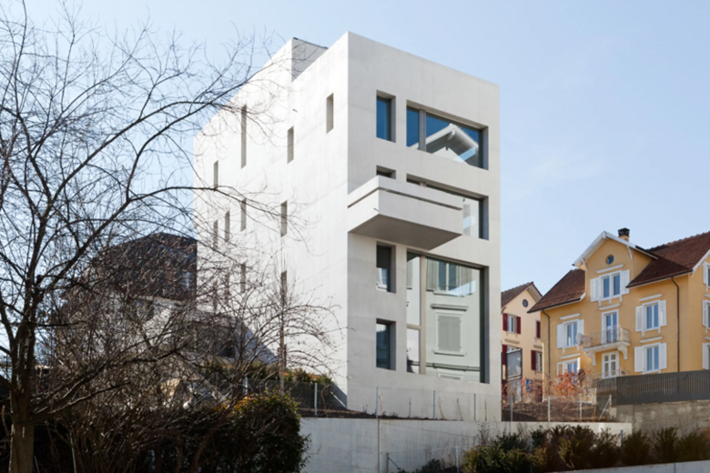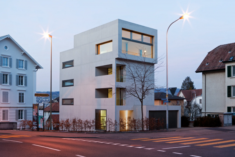 Townhouse One ist ein Einfamilienhaus mit Sichtbeton-Fassade und einer beeindruckenden Aussicht über den Zürichsee. Die halbgeschossig versetzten Geschosse in Splitleveln ergeben eine Raumskulptur, die immer neue Sichtbezüge, Durchblicke und unterschiedliche Raumhöhen ermöglicht. Je nach Raumnutzung entstehen so ein-, eineinhalb- oder auch zweigeschossige Räume mit wechselnder Orientierung. Die präzise gesetzten Fenster und Öffnungen unterstreichen das Konzept. Die Erdsondenheizung mit sommerlicher Kühlfunktion erzeugt auf ökologische Weise Wärme. Das Gebäude ist Minergie-zertifiziert.