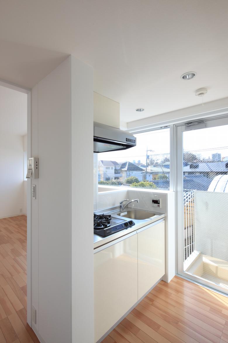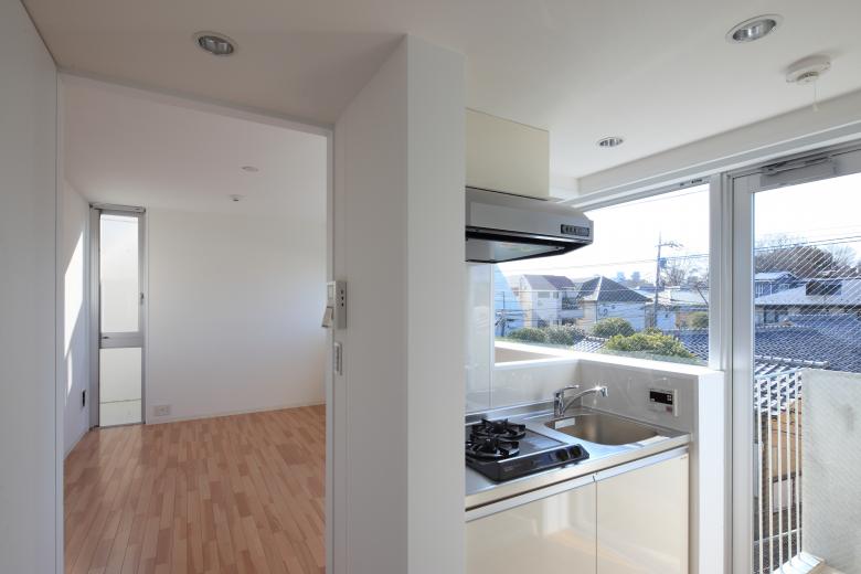 The units on the second and third floors facing the road to the west draw in the expansive external landscape through a series of horizontal windows running continuously from the living area to the kitchen. Combined with the light and breeze entering through the vertical openings on the south side, this creates an atmosphere that blends a sense of secure enclosure with a refreshing sense of openness.