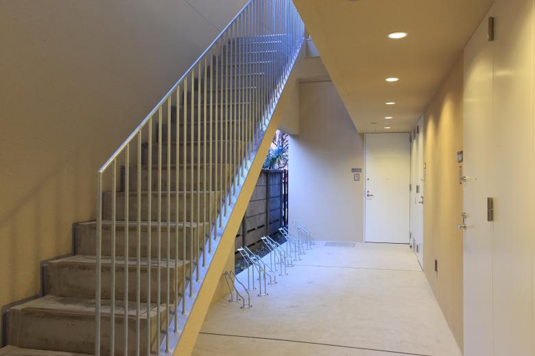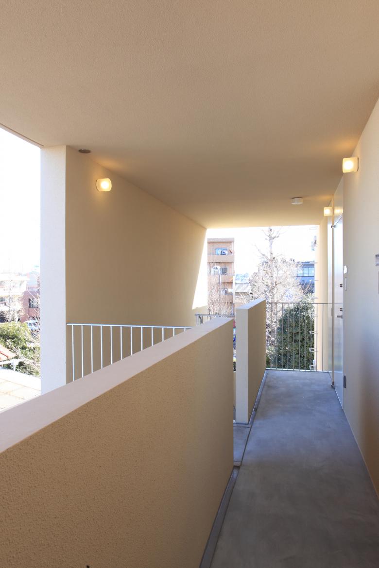 On a rectangular site extending east to west, a simple rectangular floor plan is arranged, with three units on each of the three storeys. The covered communal corridor and external staircase are compactly situated on the north side.