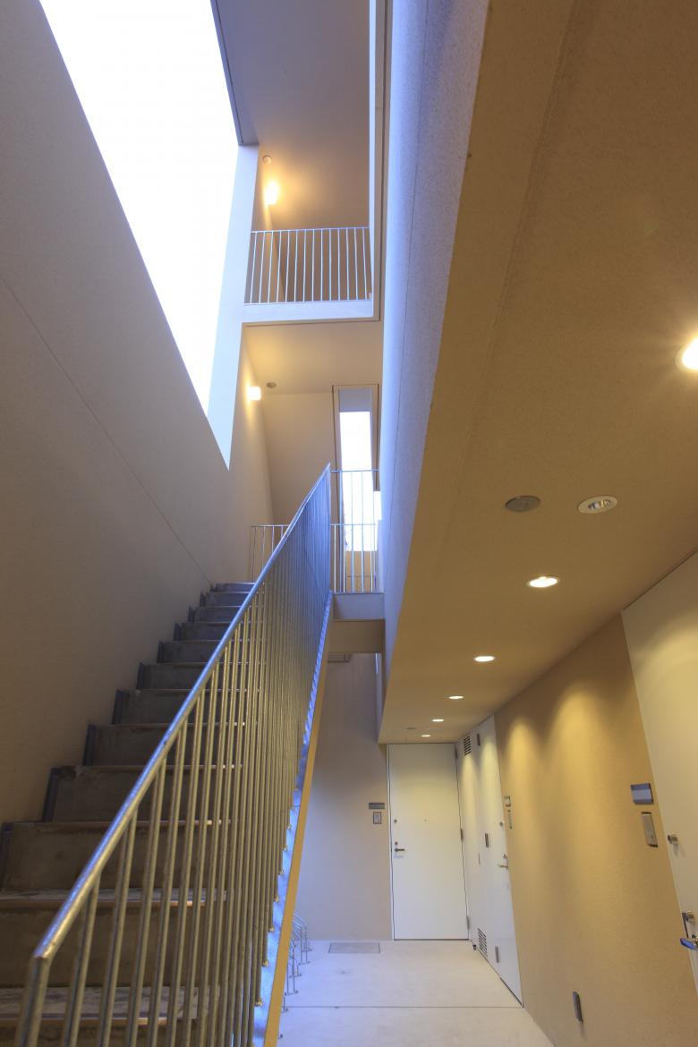 As one ascends the stairs on the way to the residential units, one casually encounters the surrounding landscape framed by the large openings and can sense the daily changes in light and weather.