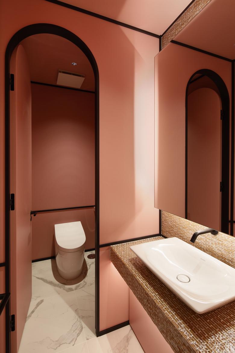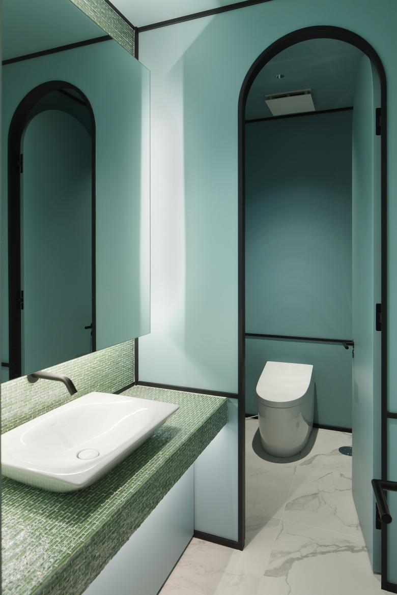 A membership studio opened in Shinbashi 4-chome, Minato-ku, Tokyo, that uses AI technology to analyze swings and simulation golf to measure data as you play around the course. The plan is minimalist, consisting of a lounge, two golf ranges, and restrooms. The hitting range has a green base color and brown artificial turf, a color tone not found in other facilities, to give it a luxurious feel. The lounge is accented with GOLD, the theme color of AIGIA Studio, and is a luxurious space where golfers can watch live golf broadcasts on a large screen while sipping champagne during golf breaks. The brass gate and reception counter, the stainless steel ceiling and walls that are reminiscent of the surface of the water, the herringbone floor, and the restrooms with glass mosaics are all materials used with sporty and luxury in mind. The universal design mixes quality with period elements, creating a space that offers a trip to a different world from the image of Shimbashi.