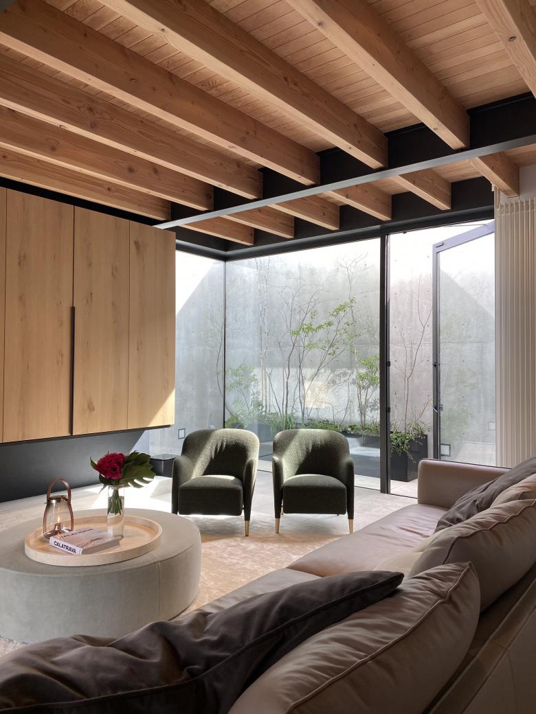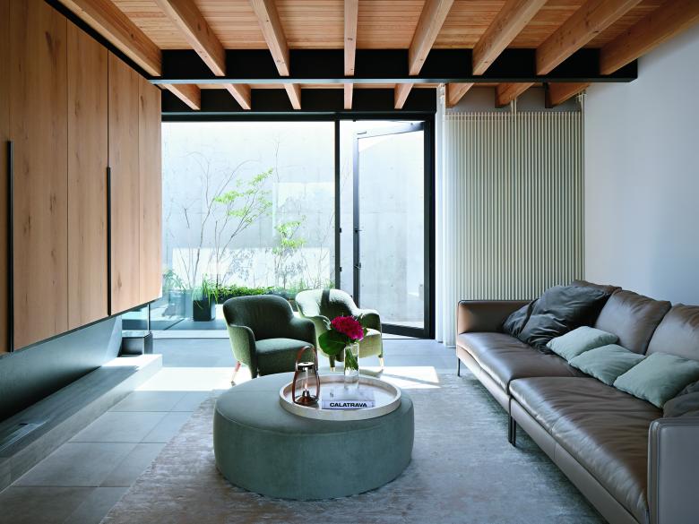 This is an urban residence with a basement + 2 stories above ground, taking advantage of the difference in elevation of the site. It features a mixed structure of wood, concrete, and steel. The concrete wall from the basement is extended and used as a wall surrounding the first floor. By building a nested wooden two-story structure inside the wall, privacy is ensured. The first floor, where the living room, dining room, and kitchen are located, is a dynamic 74m2 one-room structure built using a combination of basic axial construction methods and steel beams. A 48m2 terrace in the northeast corner, accessible from both the kitchen and the living room, functions as a comfortable private space in continuity with the interior. In contrast to the calm exterior, the interior of this open house is filled with light, wind, and a sense of connection with the outdoors.