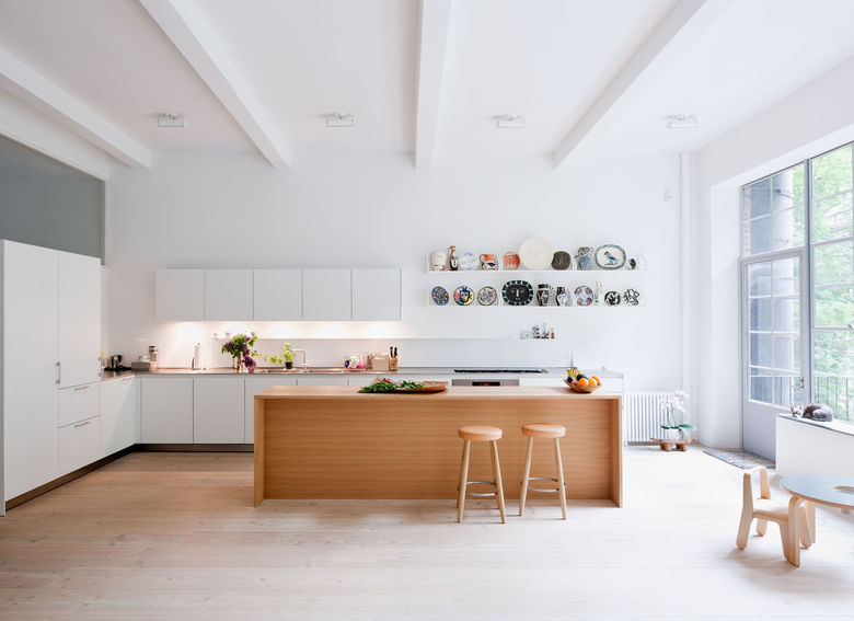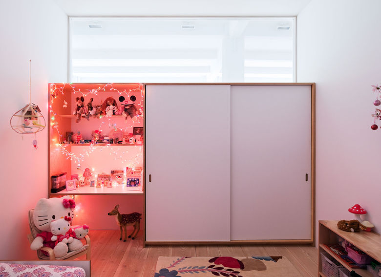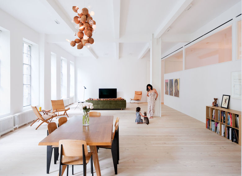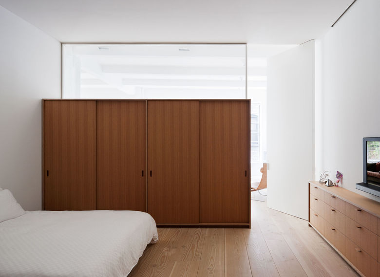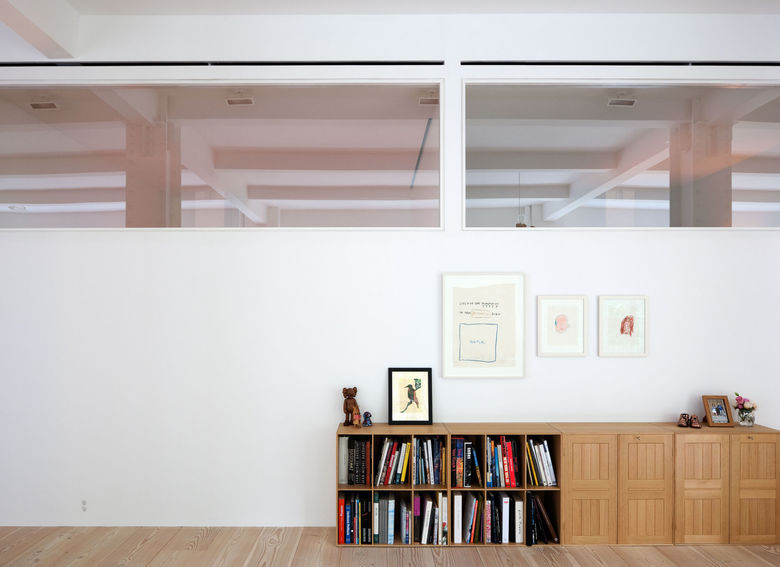 This Greenwich Village loft was previously used as an artist’s studio. The renovation created generous bedrooms and hidden storage for a couple and their two children. Lowering the windowsills in the open living room and kitchen maximizes sun in the common areas. A low wall with reflective glass transom windows allows daylight into the bedrooms while preserving privacy. The south window was converted into a door to create a small outdoor balcony. Each child’s room has closets and a built-in desk, and the large storage room behind the bedrooms serves as circulation between the private rooms. Partitioning the private areas behind a single wall retained the spacious, industrial character of the space.
