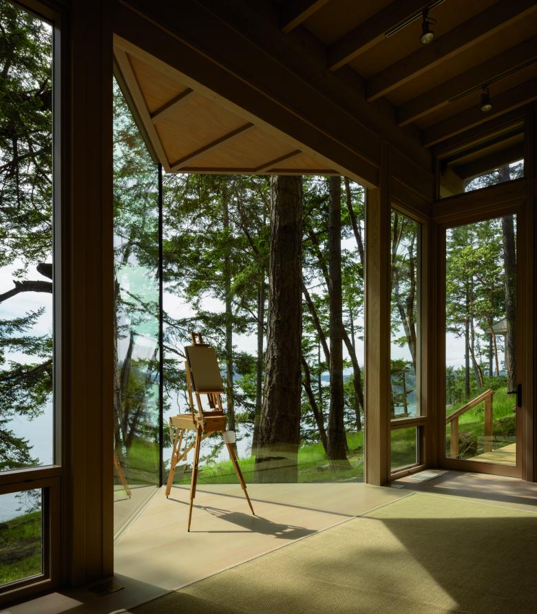 “I think of this studio as a ‘child’ of the ‘mother house’ up the hillside. Each has a triangular bay window that helps you to feel as if you are floating over the bluff, one with the treetops and water below. The owner has been inspired to do some beautiful watercolors there.” –Jim Olson, FAIA, Design Principal