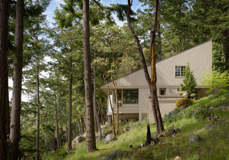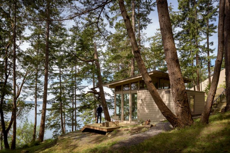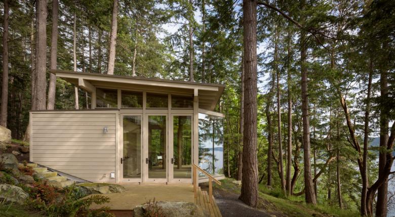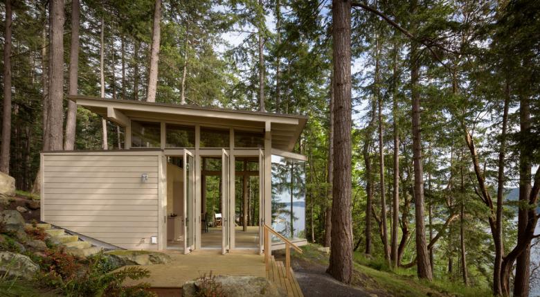 An intimate study in scale, this compact 450 square-foot cabin makes the most of its remote site on a forested bluff overlooking the water in the San Juan Islands. Consisting essentially of a single room, the wood-framed cabin offers flexible space as a painting studio or a guesthouse. The back of the structure gently nestles into the hillside bounded by existing trees and boulders, enclosing a micro kitchen and bathroom. The front side cantilevers out over the slope, its open studio space circumscribed on three sides by floor-to-ceiling glass walls. The front wall breaks the square with a “magic” window that angles out to a point, opening the cabin to sweeping views of the water and islands beyond, along with creating an inspiring spot to set up an easel.
