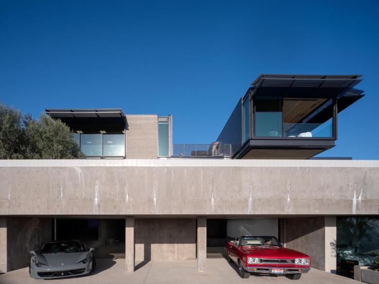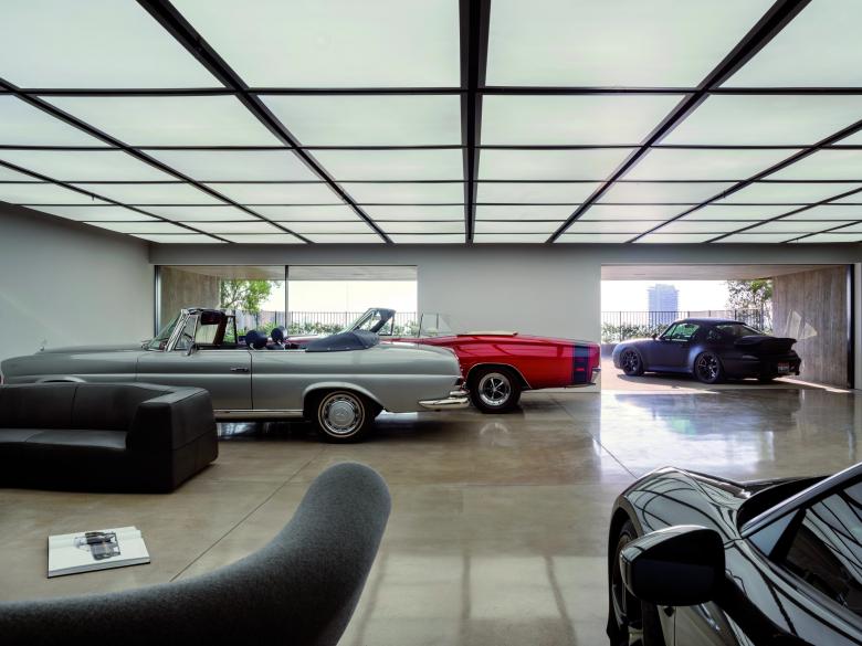This connection to the outdoors continues on the upper level, which contains the master bedroom and a den, home gym, and a series of roof decks. The lower level reflects the client’s personal interests and hobbies, containing an auto gallery, game room and media room. A large outdoor terrace extends from the auto gallery, cantilevering out over the hillside with unobstructed views of the cityscape.