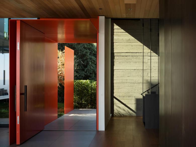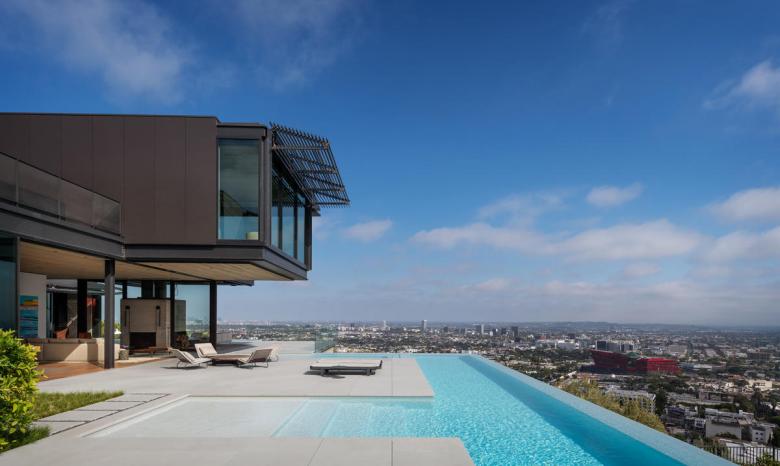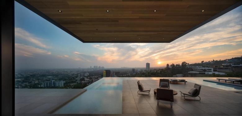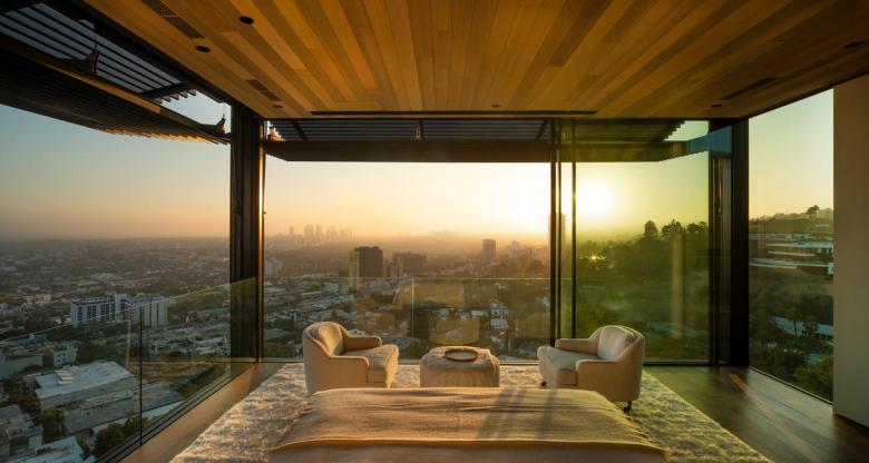 On the home’s main level, which contains the kitchen, dining and living areas, a series of retractable window walls open the home completely to outdoor terraces wrapping the exterior. Sliding window walls in the living area, kitchen, and north bedroom complement a pair of “guillotine” window walls in the dining area and two pivoting window walls on the south side of the living area. Together, this substantial series of operable window walls merges indoor and outdoor spaces, extending the livable space outside into the temperate Southern California climate. The main terrace off the dining and living area leads to a swimming pool overlooking a grove of olive trees on the hillside below, with the Los Angeles city skyline stretching out in the distance.