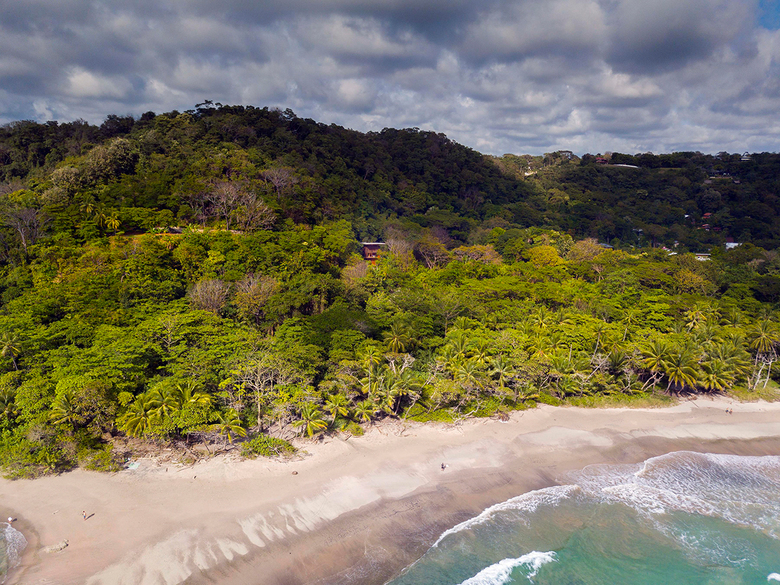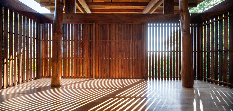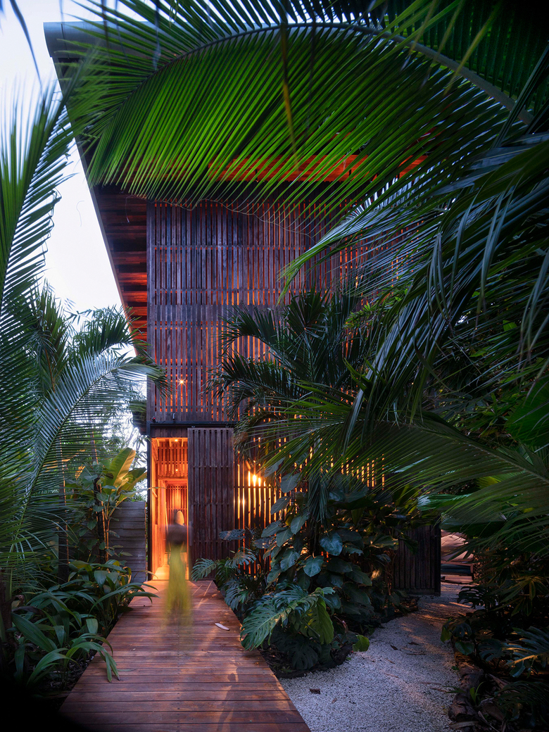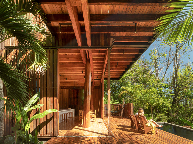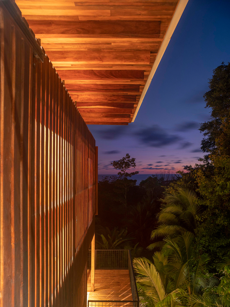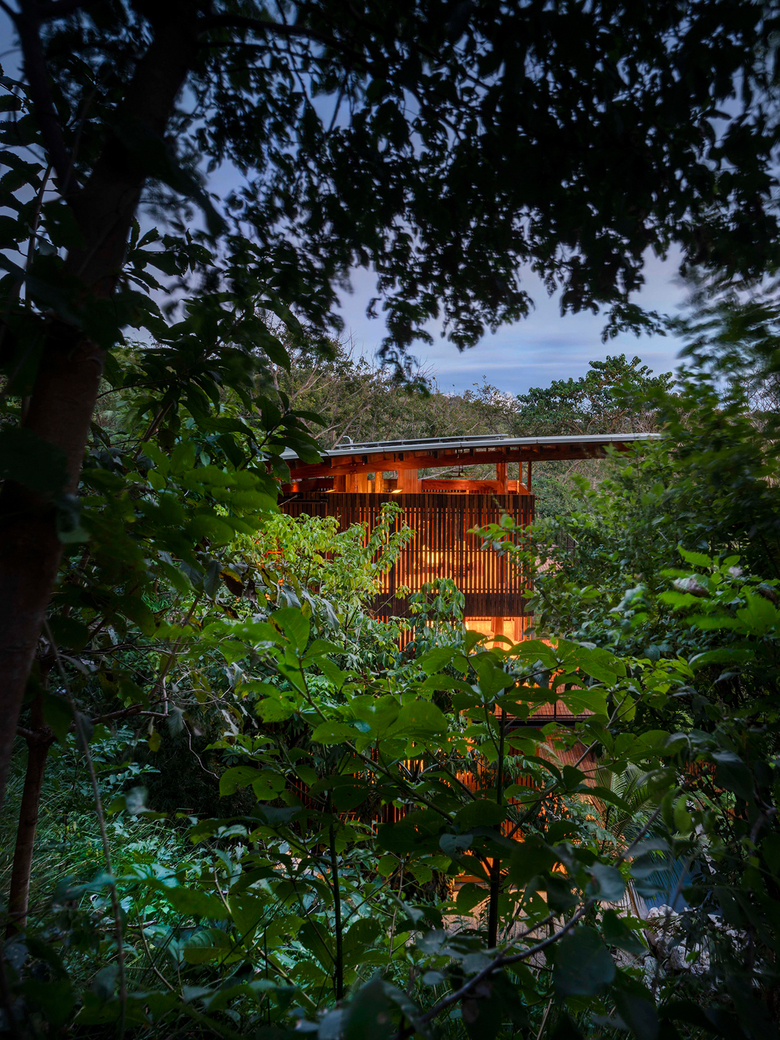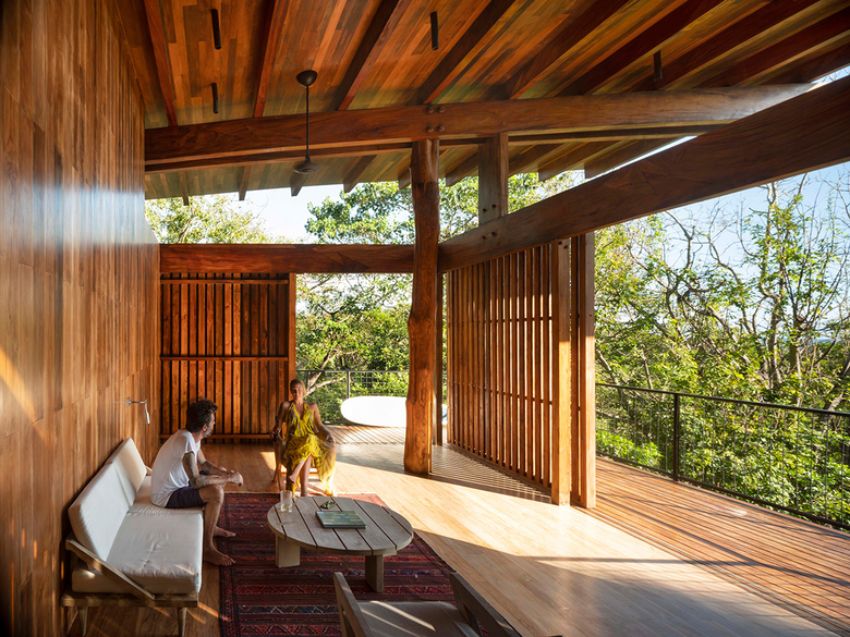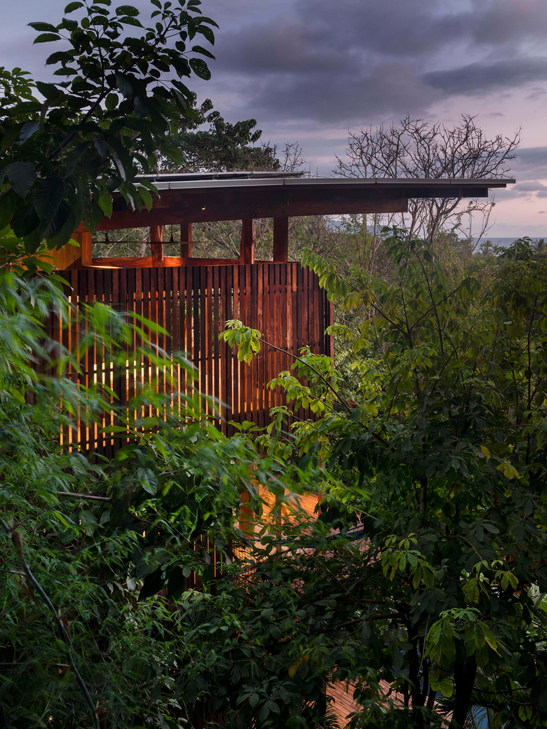 Costa Rica Treehouse is inspired by the jungle of this densely forested site on the Pacific Coast of Costa Rica. Built entirely of teak wood harvested on-site, the retreat engages with the jungle at each of its three levels: at the forest floor, the middle floor is nestled within the trees, and the top level rises above the tree canopy with views of the surf at nearby Playa Hermosa beach.