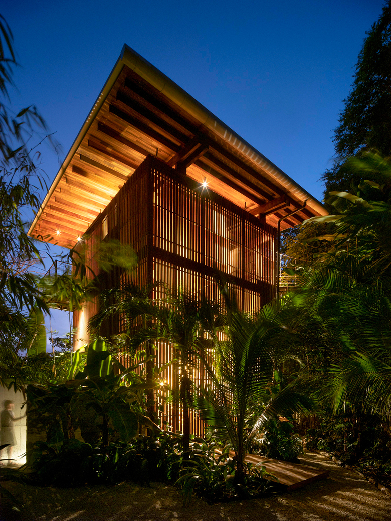 Designed to operate passively, the home is intended to breathe and remain open to the elements in this temperate semi-tropic environment. The top and bottom floors are completely open to the elements with a double-screen operable wood shutter system, allowing daylight and natural ventilation, but also privacy and security when the owners are away. Shading, a 3.5-kW photovoltaic array, and a rainwater collection system make the house’s compact footprint even lighter on the land.