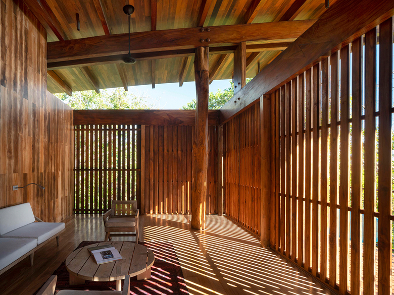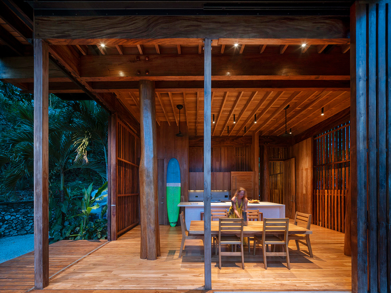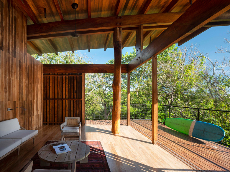 The clients are surfers as well as avid environmentalists, and this project reflects their deep commitment to sustainable land management in Costa Rica. Designed as an open-air surfer hut, the project engages the Costa Rican landscape in various ways, from the vegetation accessible just off the main floor, to the larger weather and surf patterns one can experience on the top level.