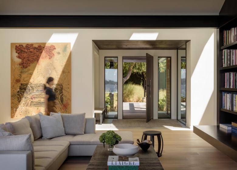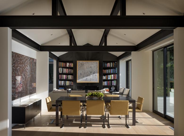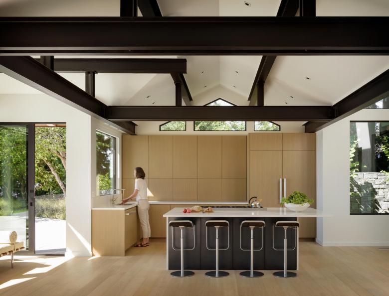 Inside, the home is organized around a central gallery spine with skylights that draw abundant natural light into the core of the house and surrounding rooms. Heavily articulated log and timber columns and beams were removed and replaced with a thin steel framework, opening up the space both physically and visually. An interior reconfiguration and a strategic above-garage addition provide new children’s bedrooms, a study and guest rooms, better supporting the young family’s lifestyle.