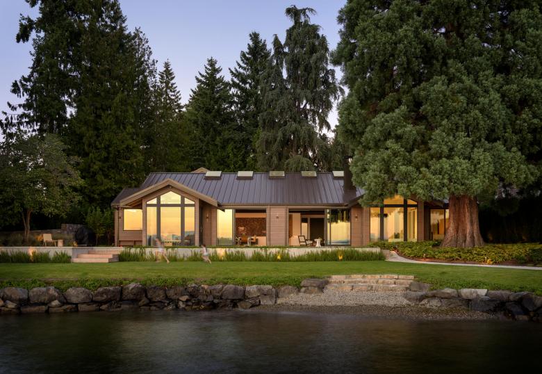 The building’s former rustic "lodge style" exterior was updated to a refined language of taut wood planes and a crisp metal roof and windows. Adding large operable doors and window walls helped optimize natural light and provide views to nearby Lake Washington. Extensive site improvements including native gardens, terraces and beachfront features provide new places for indoor/outdoor living.