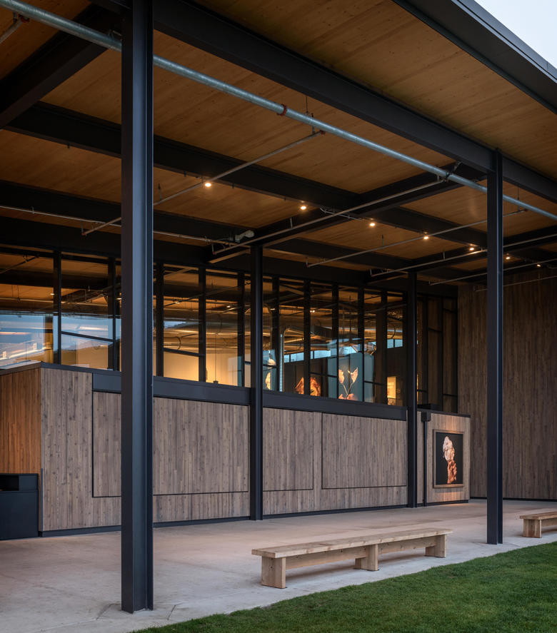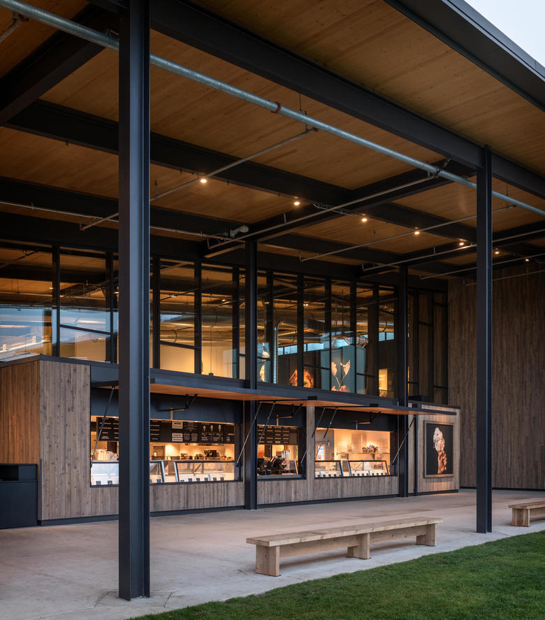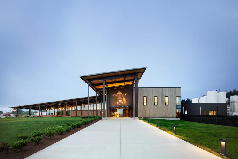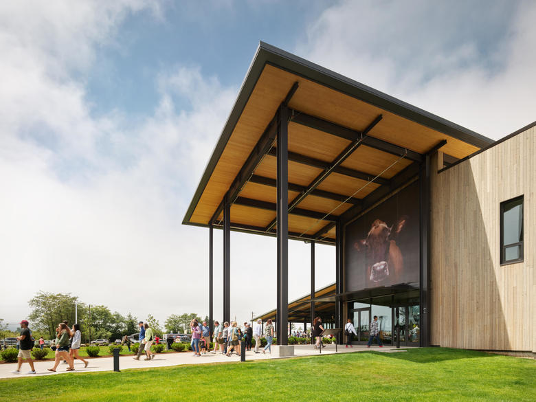 Drawing on Tillamook’s agricultural origins, the visitor experience consists of a modern barn structure with a simple shed roof and an adjacent landscape of grasses, shrubs and trees native to the Oregon coast. The building’s form is both inviting and logical, with an exposed structure and a high degree of transparency throughout. Inside, the exhibits provide an in-depth look at dairy farming on the Oregon coast, as well as the high degree of pride Tillamook’s farmer-owners and employees have taken in their work since the cooperative’s founding in 1909.